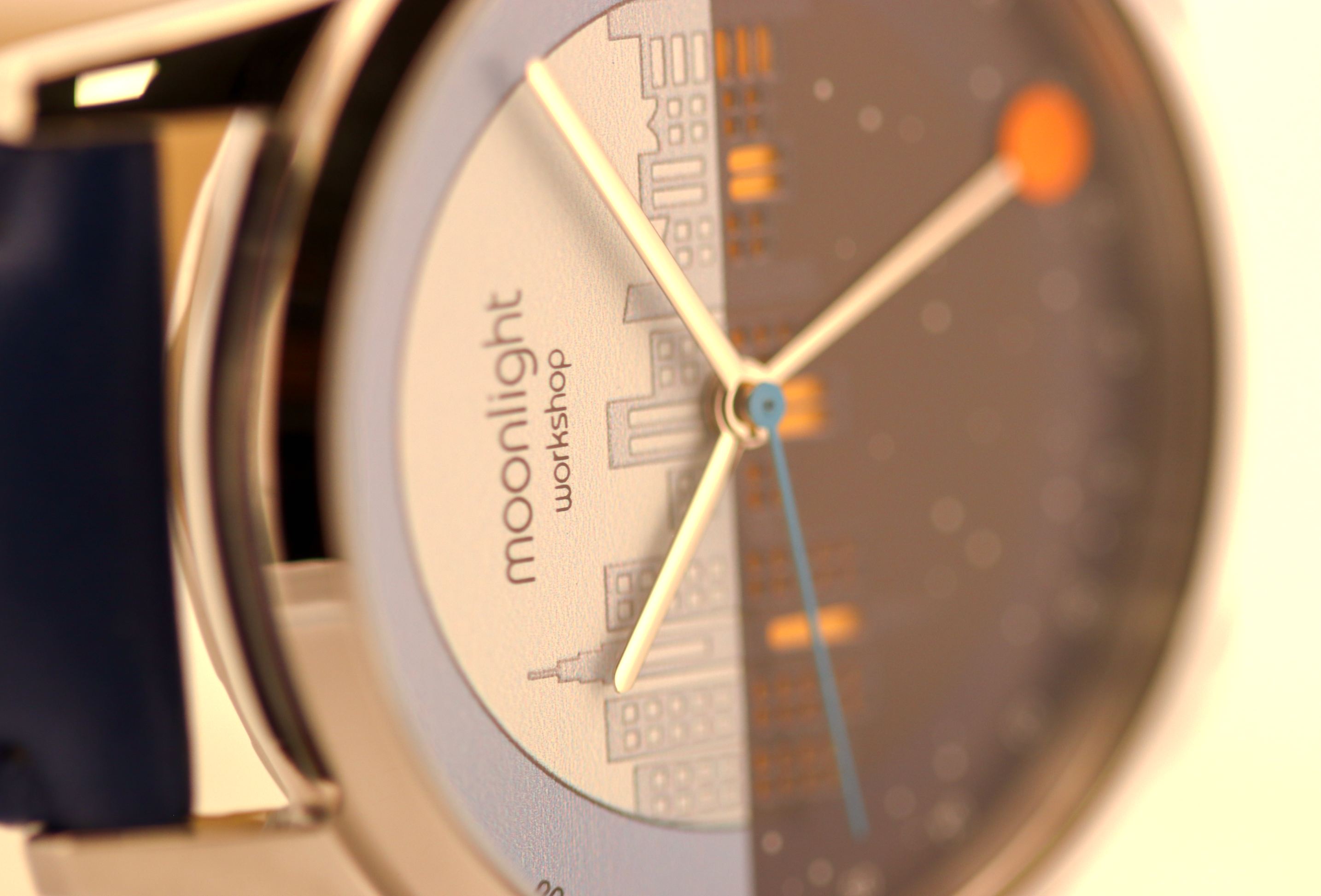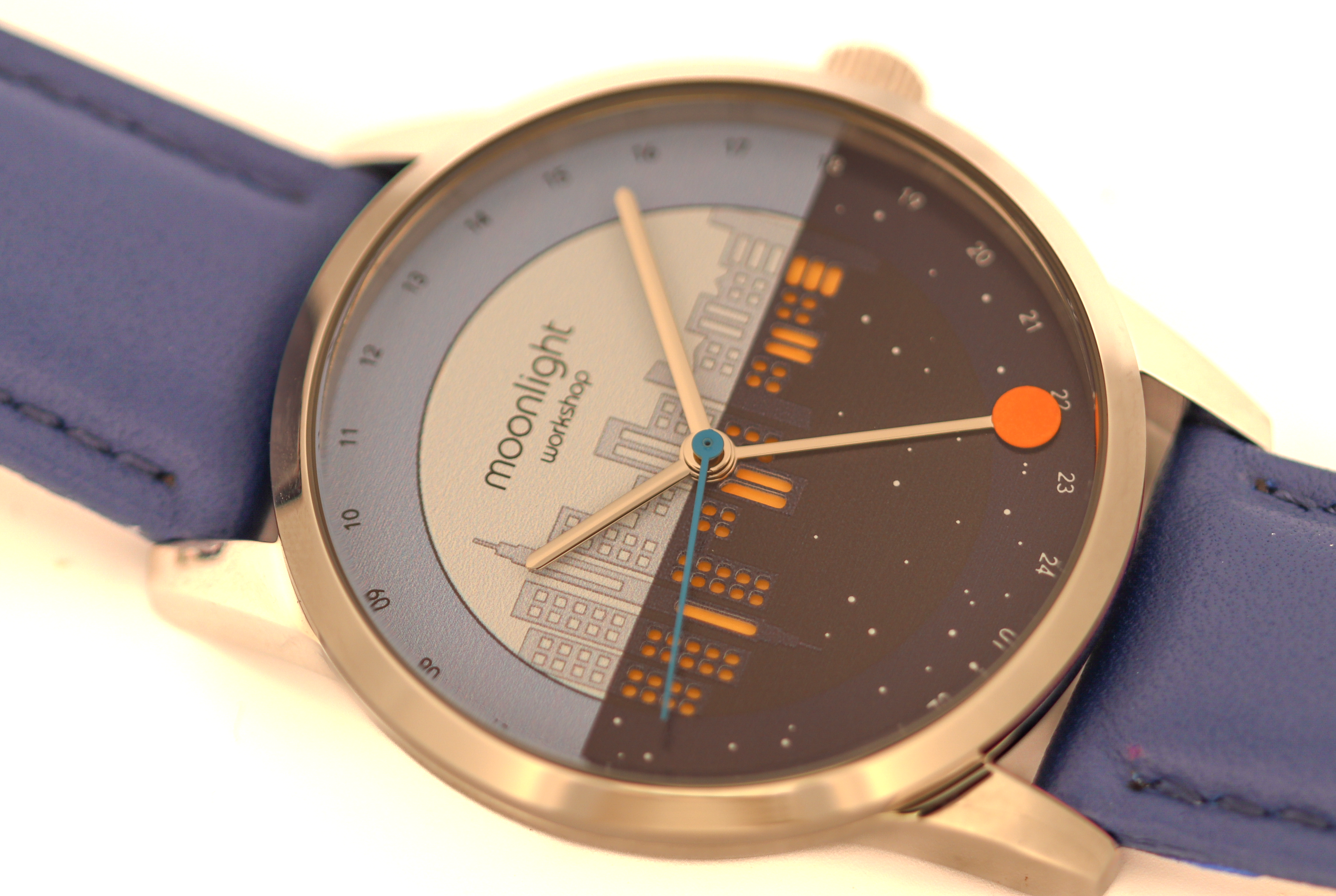 Introducing Skyline Orbit, an urban interpretation of our Moonlight Lumis concept. With a Swiss GMT quartz movement, the GMT hand carries a glowing sun-and-moon disc that orbits the dial across a full 24-hour cycle.