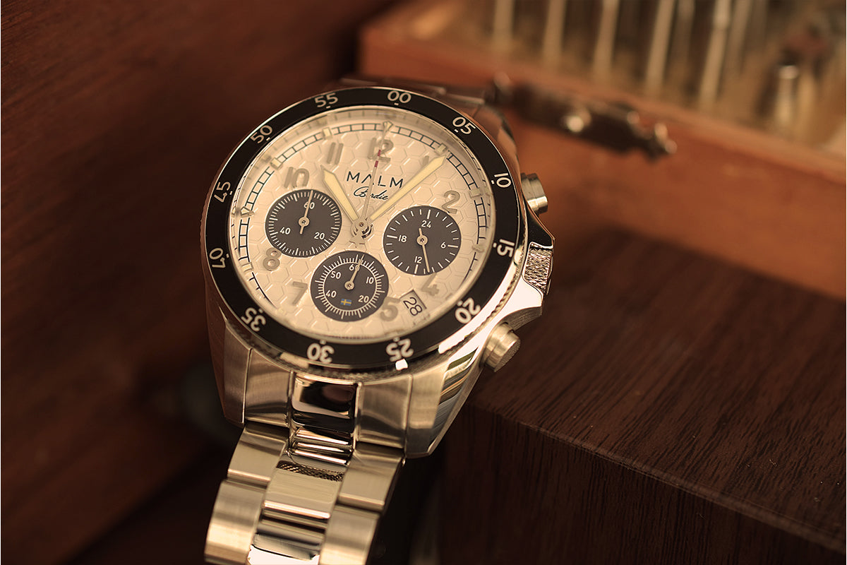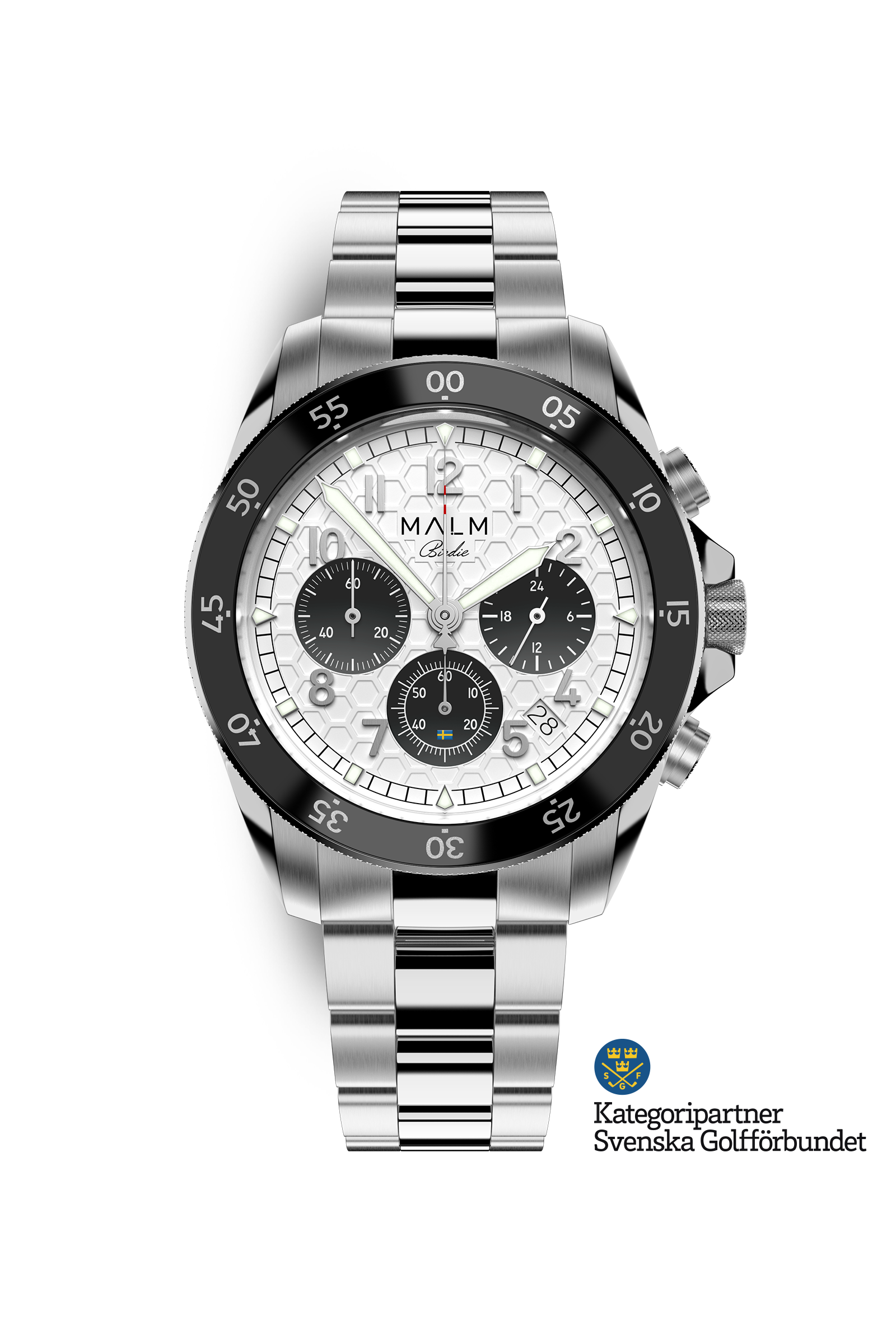 Designed for performance without sacrificing style, this is a watch made to be used. The dial features a distinctive honeycomb texture — a pattern deeply rooted in aviation engineering, known for its strength and lightweight structure, yet also reminiscent of the pattern on a golf ball. This fusion creates a striking 3D surface that bridges the worlds of aviation and golf. In the center-positioned second hand, the MALM original silhouette of the JAS 39 Gripen fighter nods to Linköping — the origin of the watch and the capital of Swedish aviation. A subtle Swedish flag rests in the lower sub-dial, celebrating its heritage. The chronograph function often found in pilot watches offers practical timekeeping on the course, while the rotating bezel introduces another versatile way to measure time.