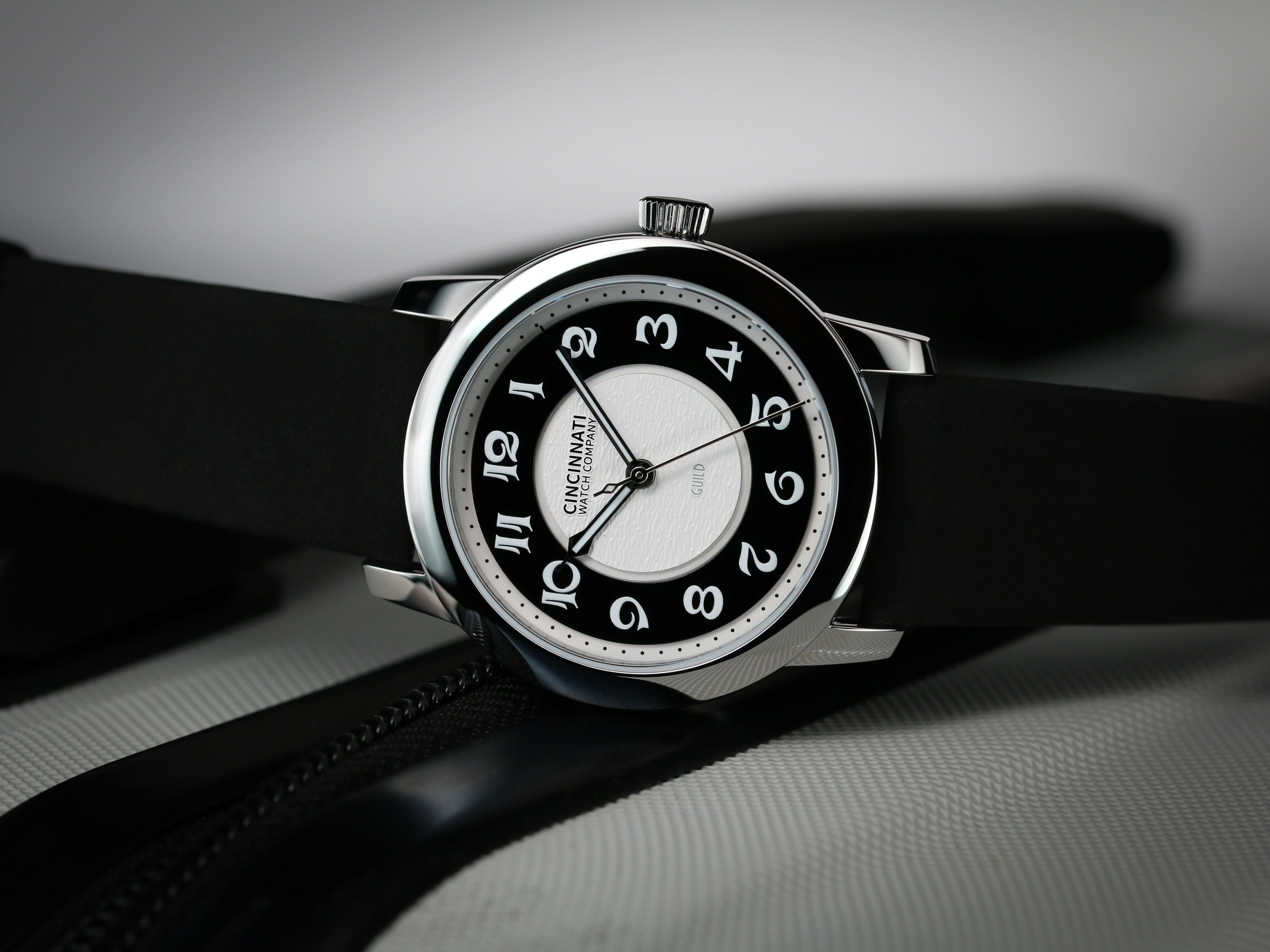 The Guild mechanical features a Swiss Made Elabore Grade SW210 manual wind movement, Sapphire Crystal, and "snow" patterned central dial section.