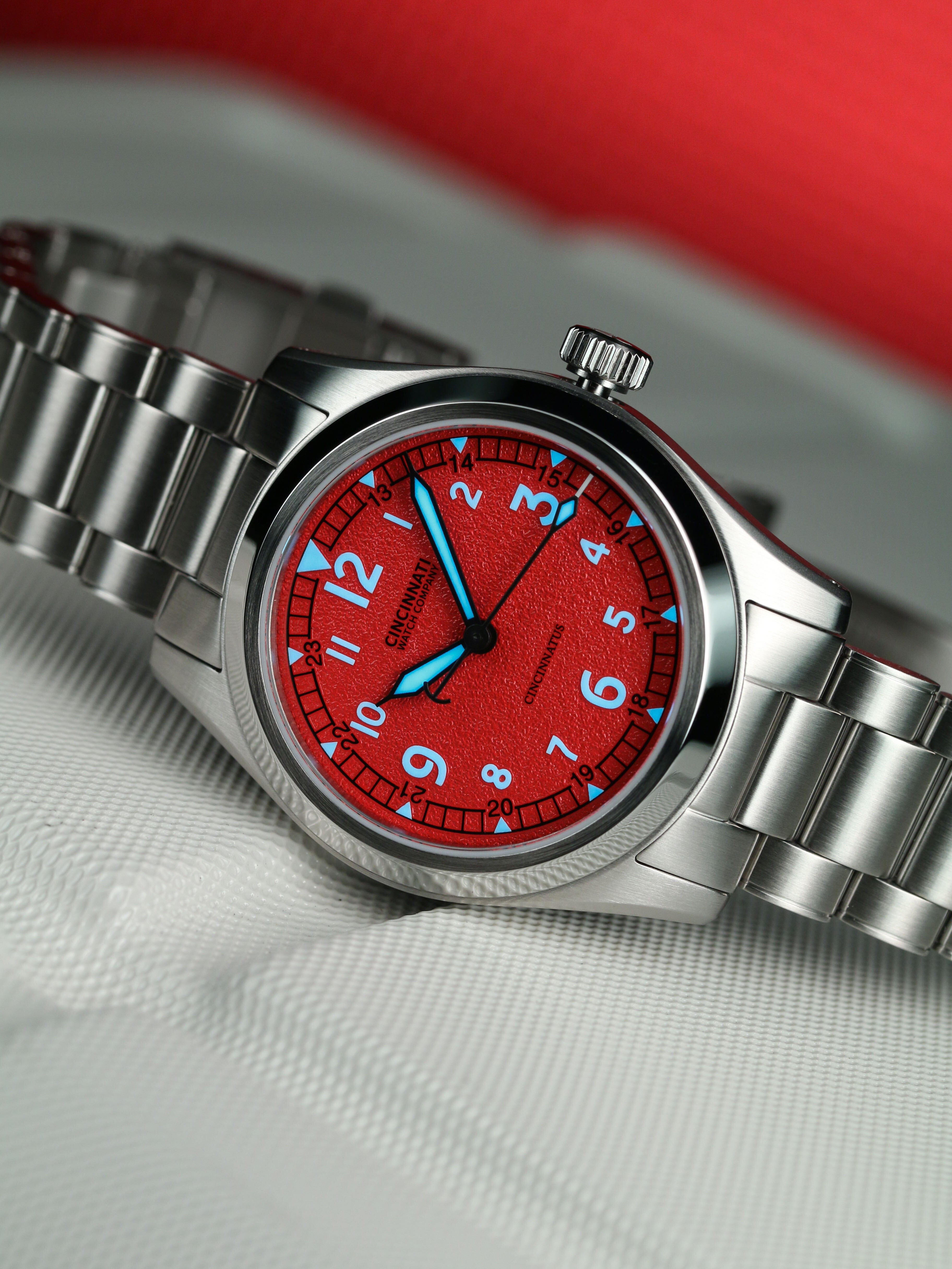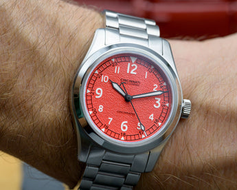 The Cincinnatus Field Watch is a rugged outdoor watch inspired by the watches worn by members of the military while serving in the field. The necessity of rugged accuracy paired with thin style, sapphire, and flat steel bezel protects angled polish that can go from the field to an evening out. The Watchmaker tests each watch for the 10 ATM water resistance and regulates the movement in 5 positions. A Quality Assurance Certificate is included with each piece, signed by the watchmaker confirming the pressure test and accuracy. The Cincinnatus is now where Rick Bell envisioned it in 2018, having refined the case and movement over time with The Watchmaker Jordan Ficklin. The Cincinnatus is thin, stylish, and rugged. Our newly updated Cincinnatus Field watch with Swiss-made hand-wound movement is no longer the Centurion. It is “The Cincinnatus” is available in Black, Burgundy, Blue, Red, and White.