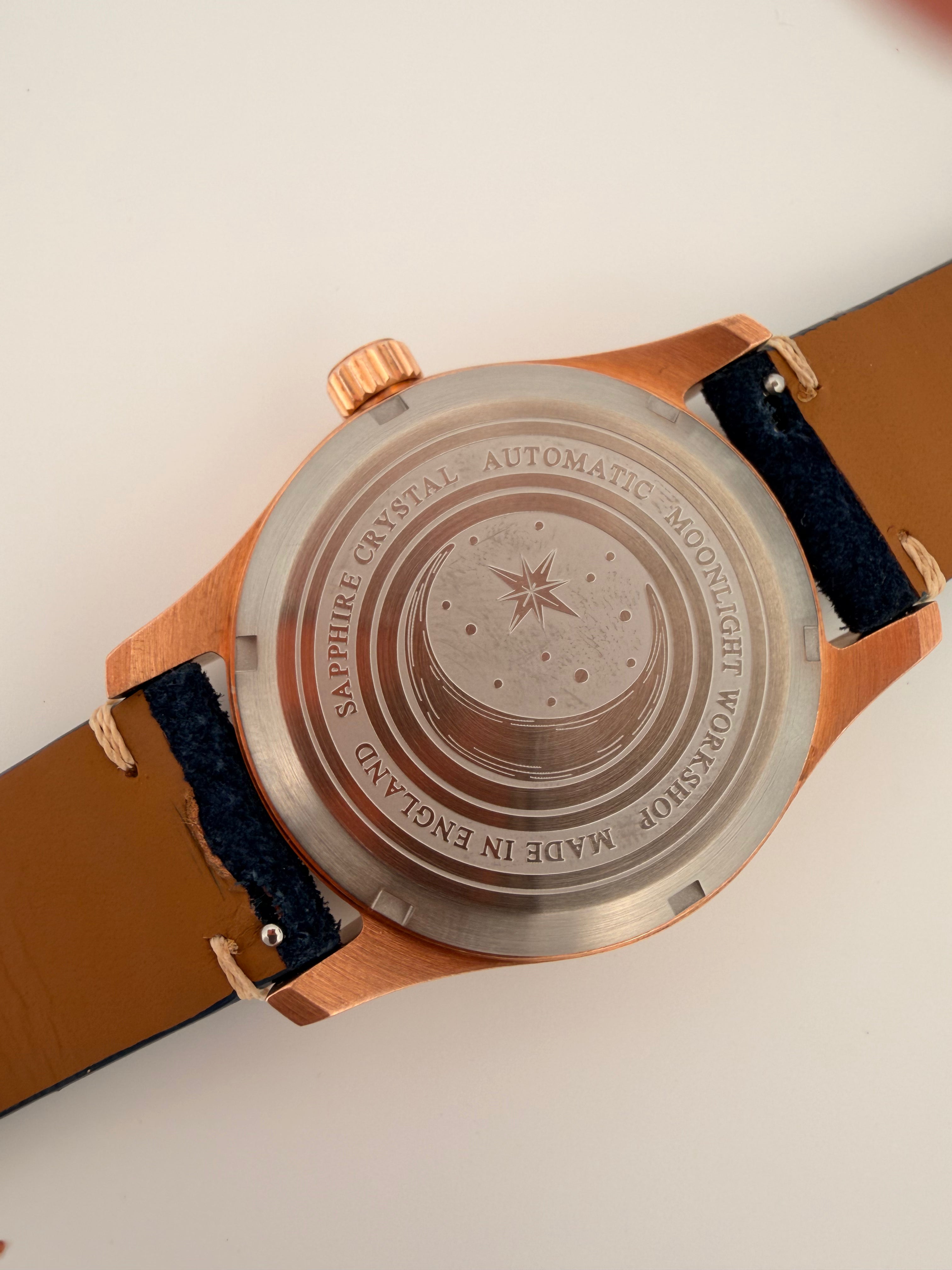 Each watch features an etched caseback with the Moonlight Workshop logo, adding a final mark of authenticity and craftsmanship.
