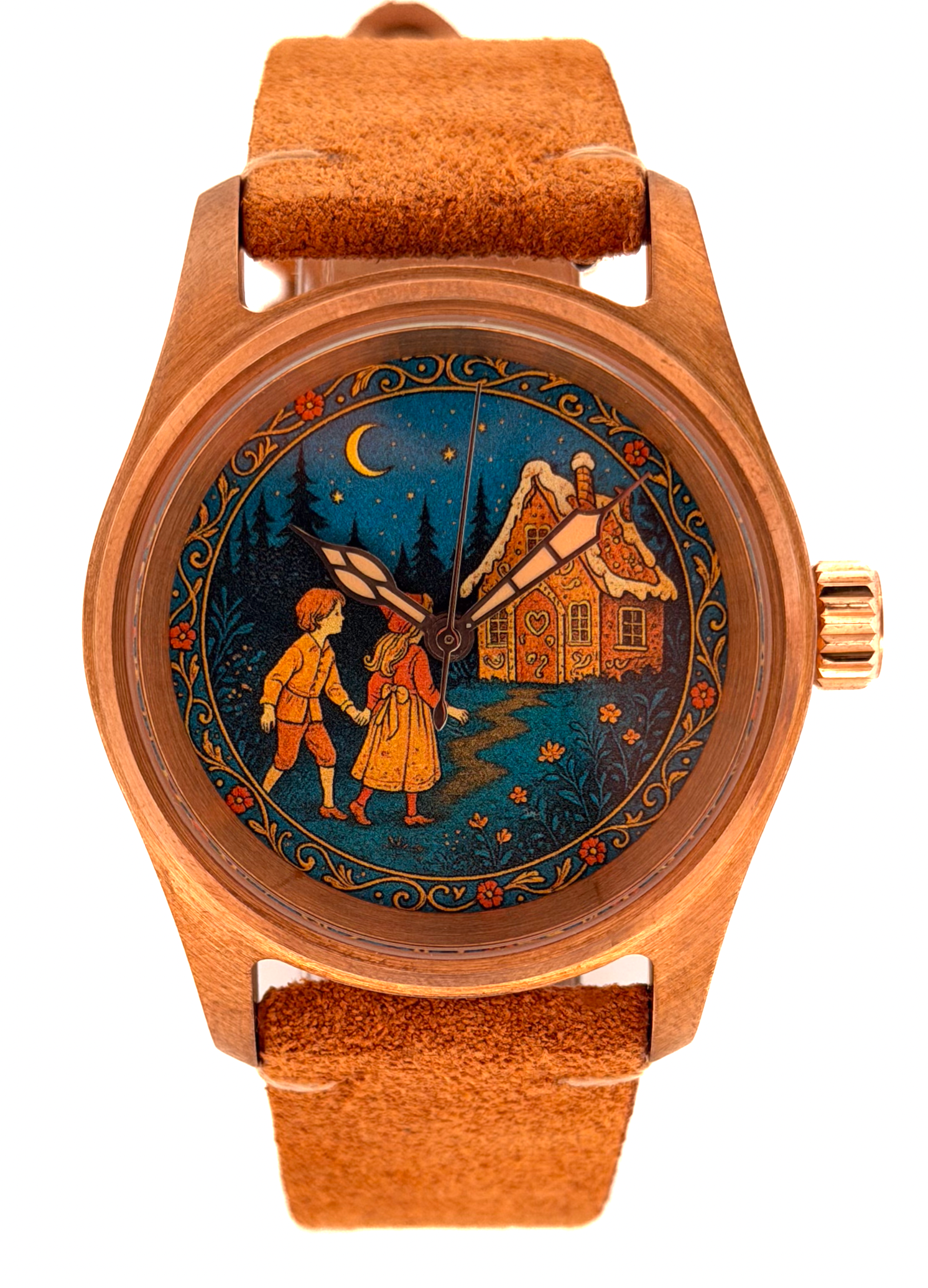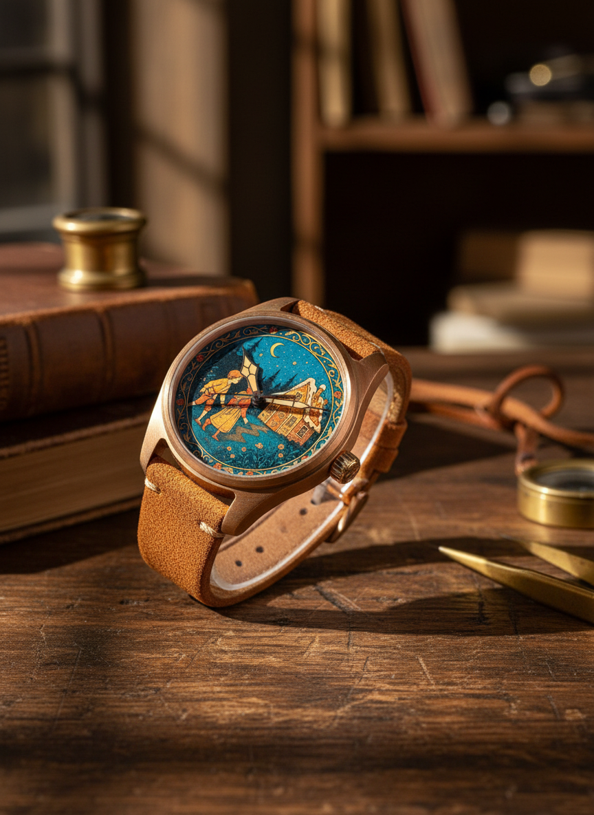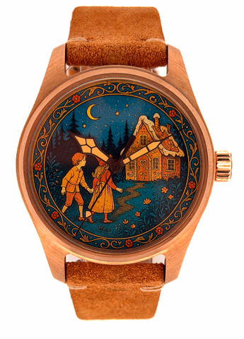 The warm bronze case is paired with a gingerbread-coloured brushed leather strap, evoking the tones of the story. Deco-style hands complement the artwork and reflect the era that inspired the watch.