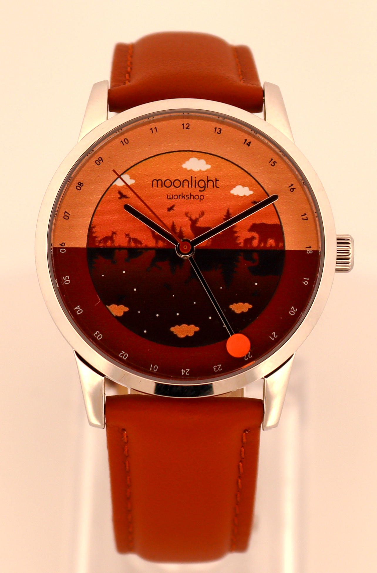 The dial artwork features layered silhouettes of stags, foxes, bears and pine trees, creating depth and storytelling through a warm forest landscape. The genuine leather strap in rich tan complements the colours beautifully, and includes a quick-release mechanism for easy swapping.