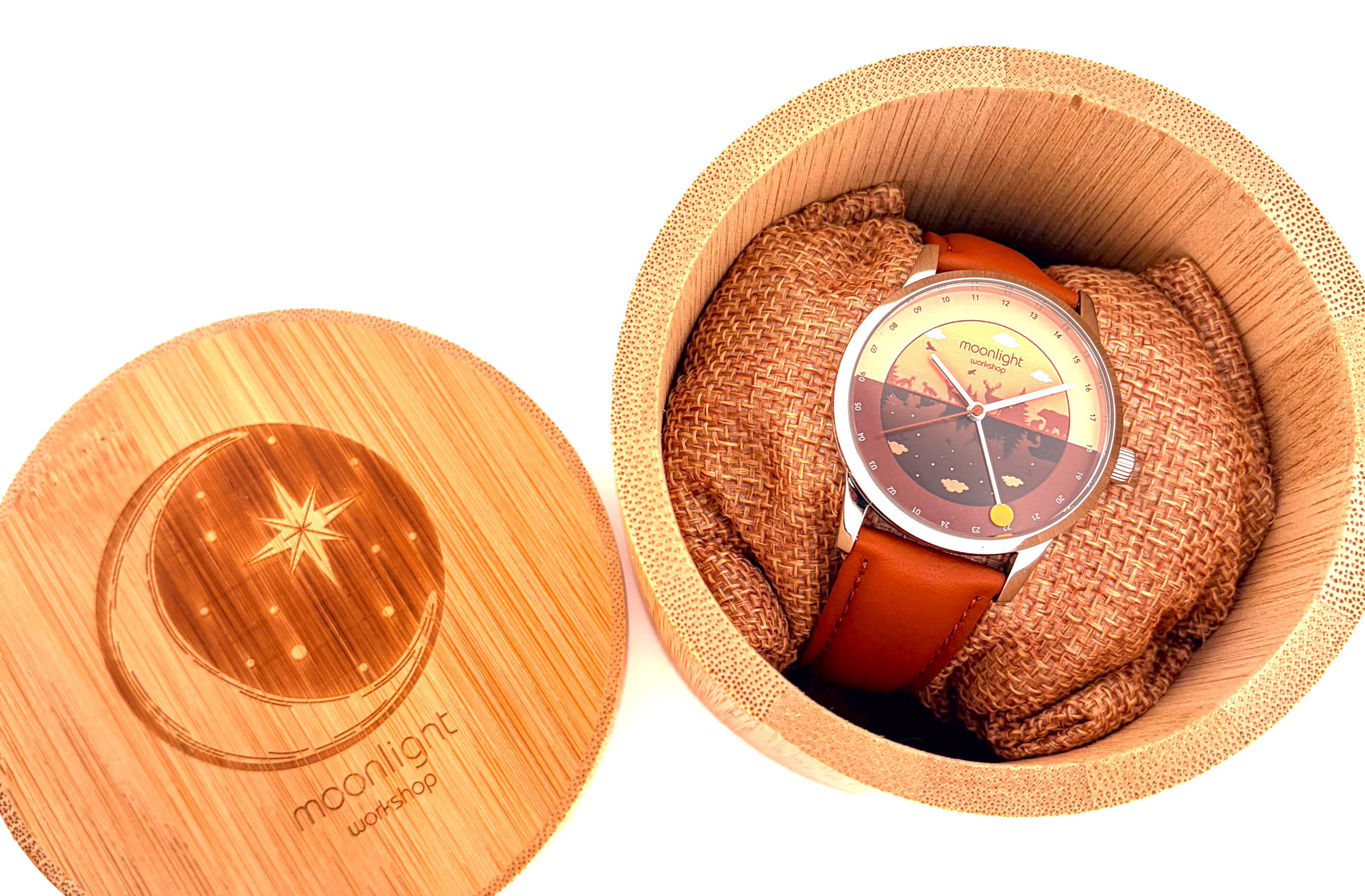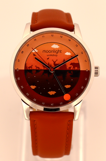 Introducing Emberwood, a warm and atmospheric entry in our Moonlight Lumis series. Built around the playful idea of reimagining how a watch tells time, Emberwood is powered by a Swiss GMT quartz movement — but with a twist. We’ve transformed the GMT hand into a glowing sun-and-moon disc that tracks a complete 24-hour arc across the dial.
