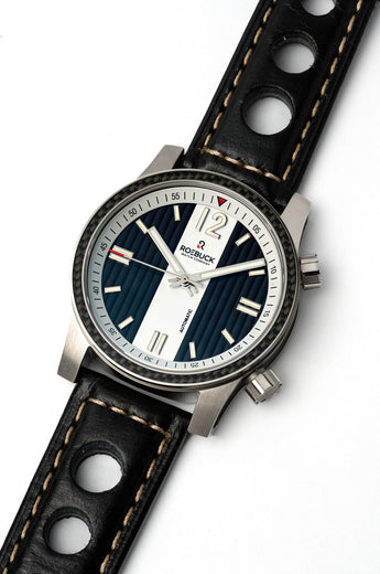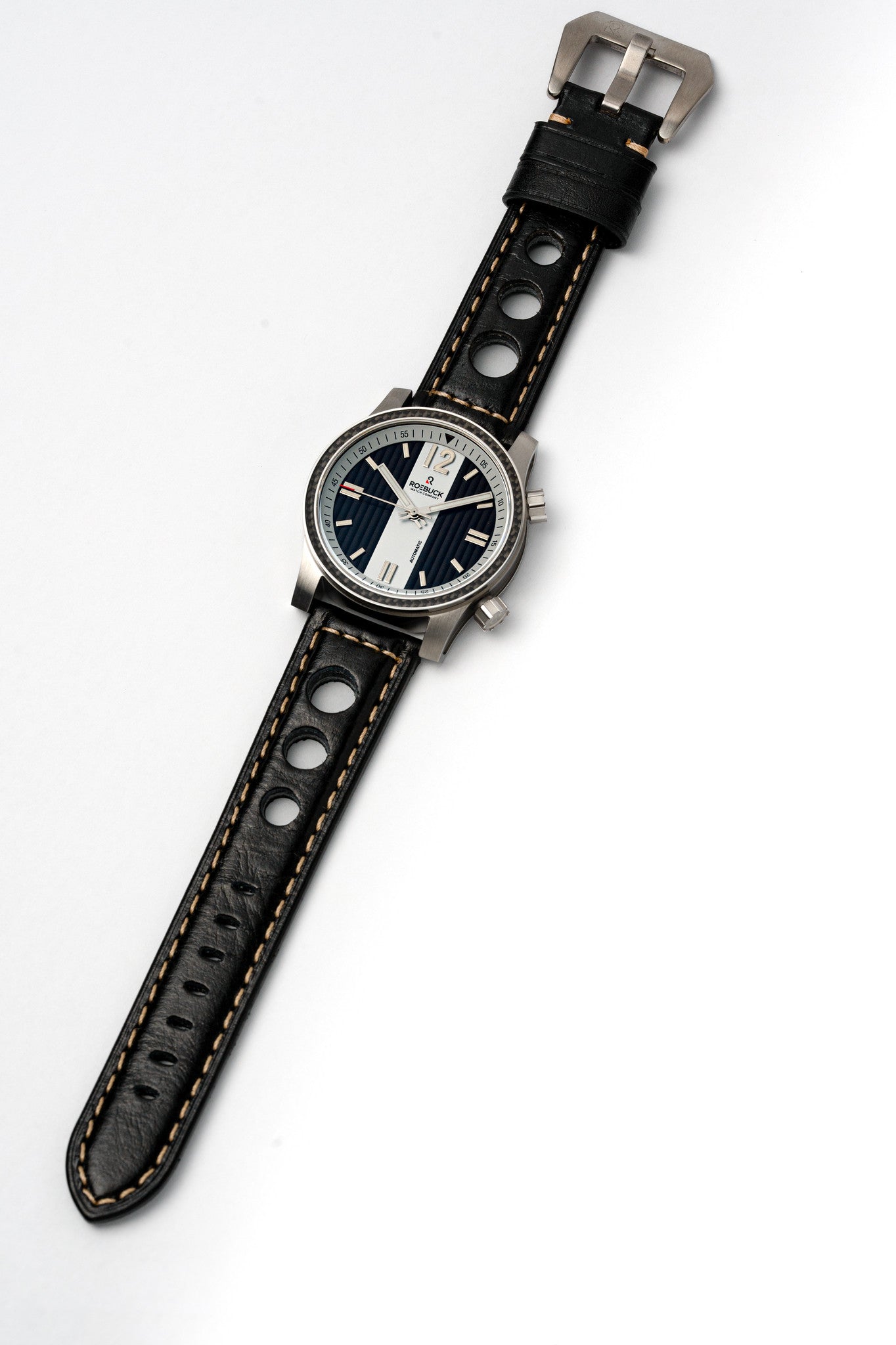 - Black 22mm tapered leather rally band with quick release spring bars, monogrammed 316L stainless steel buckle, plus: