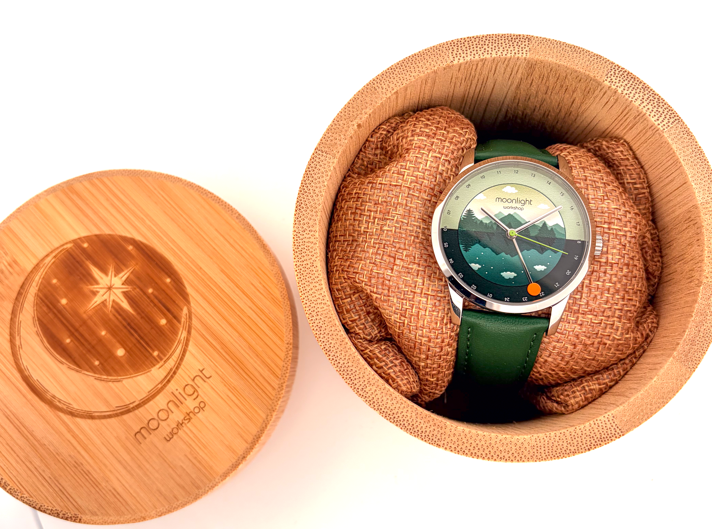 Meet Alpine Dawn, part of our Moonlight Lumis series — a playful reinvention of how a watch can tell time. Driven by a Swiss GMT quartz movement, we’ve transformed the GMT hand into a luminous sun-and-moon disc that glides through a 24-hour arc, giving you a poetic, intuitive view of the day.