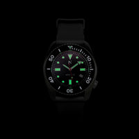 Rotate North's design principles; purpose, performance and planet, have informed every detail of the Arctic. The black dial is protected by sapphire crystal, encased in a matt ceramic bezel, with the hands and markers set in LumiNova, ensuring legibility whatever the conditions.