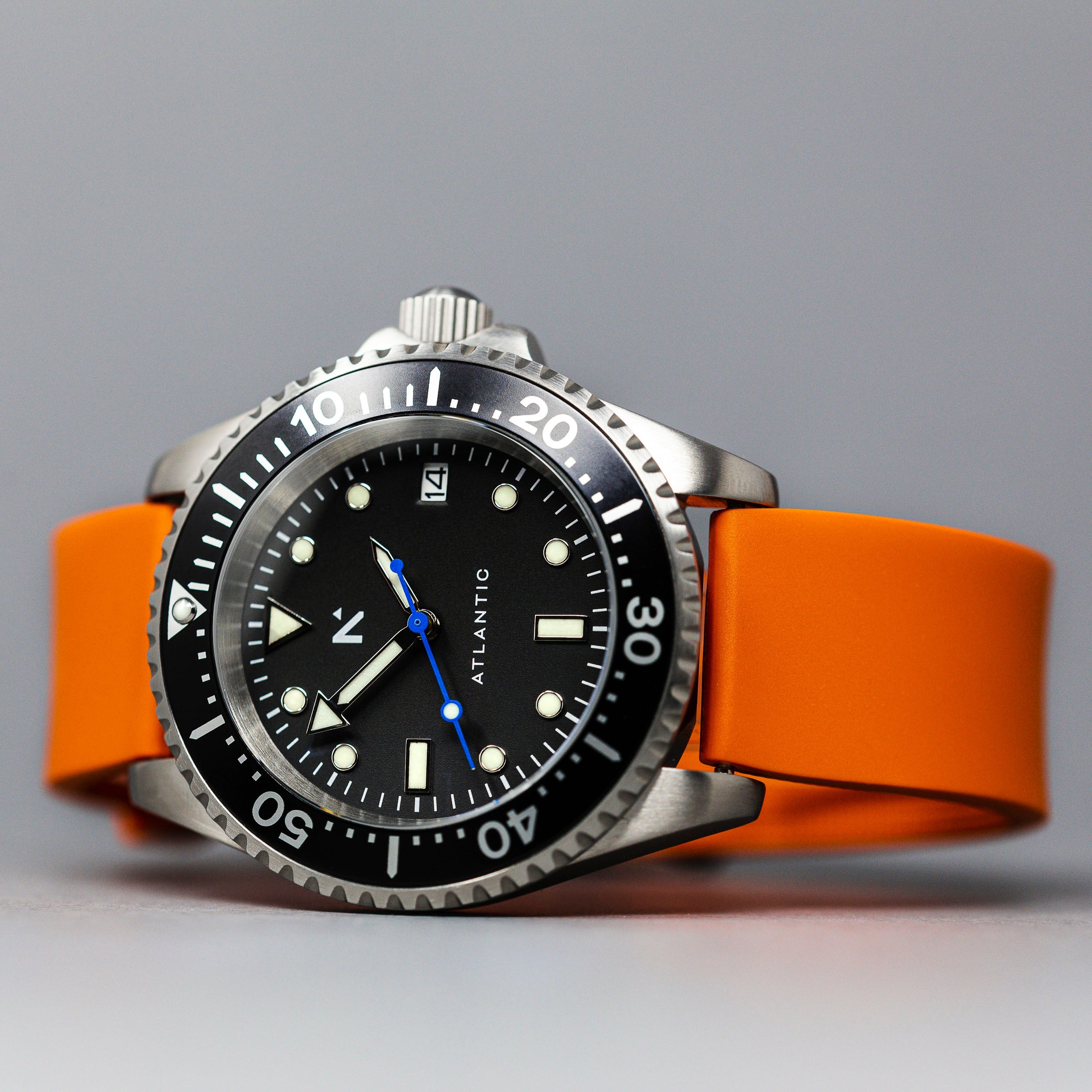The benchmark for a true diver’s watch is water resistance to 30 ATM (300 metres) and the Atlantic meets this specification. To achieve a water resistance rating of 300m the 316L stainless steel case is fitted with a pressurised screw-down caseback and guarded screw-down crown.