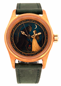 The warm bronze case is paired with a deep green brushed leather strap, chosen to complement the rich, natural tones often associated with the tale and its enchanted forest setting. Deco-style hands complete the dial, selected to reflect the era and enhance the watch’s vintage character.