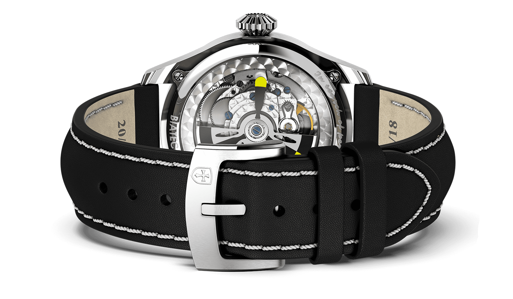 Black pilot style calf leather and white stitching as standard. Possibility to choose another strap.