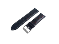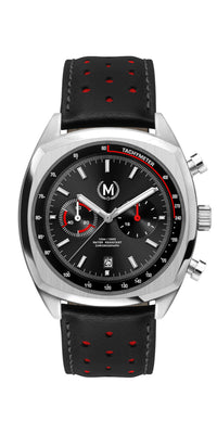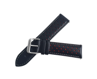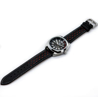 The black and red leather rally strap is a must have as it's suited for so many occasions. It has a retro flare to it which makes for a great suit watch, casual watch and sports watch! The buckle is brushed stainless steel and features our logo.