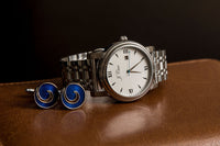 J.Ciro's Blue Cyclone Cuff Links have a unique metallic blue enamel swirl accompanied by a stainless steel finish cuff link back. This design is a modern twist on traditional styles.