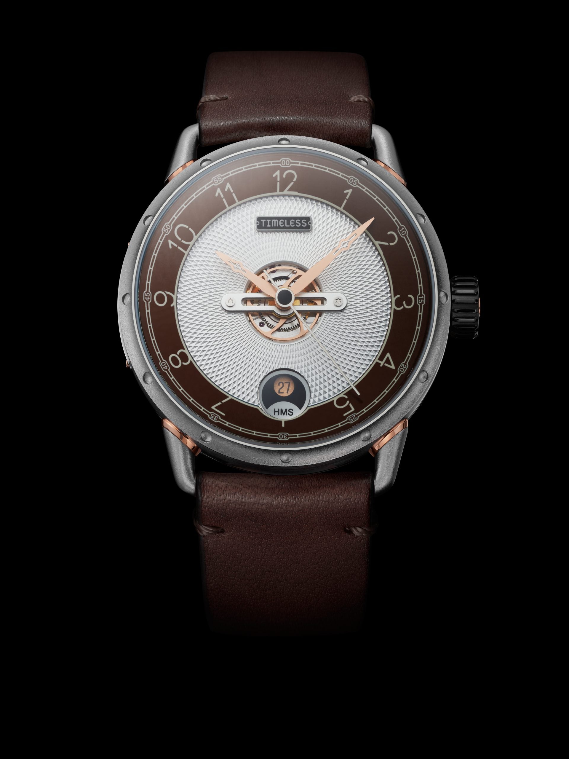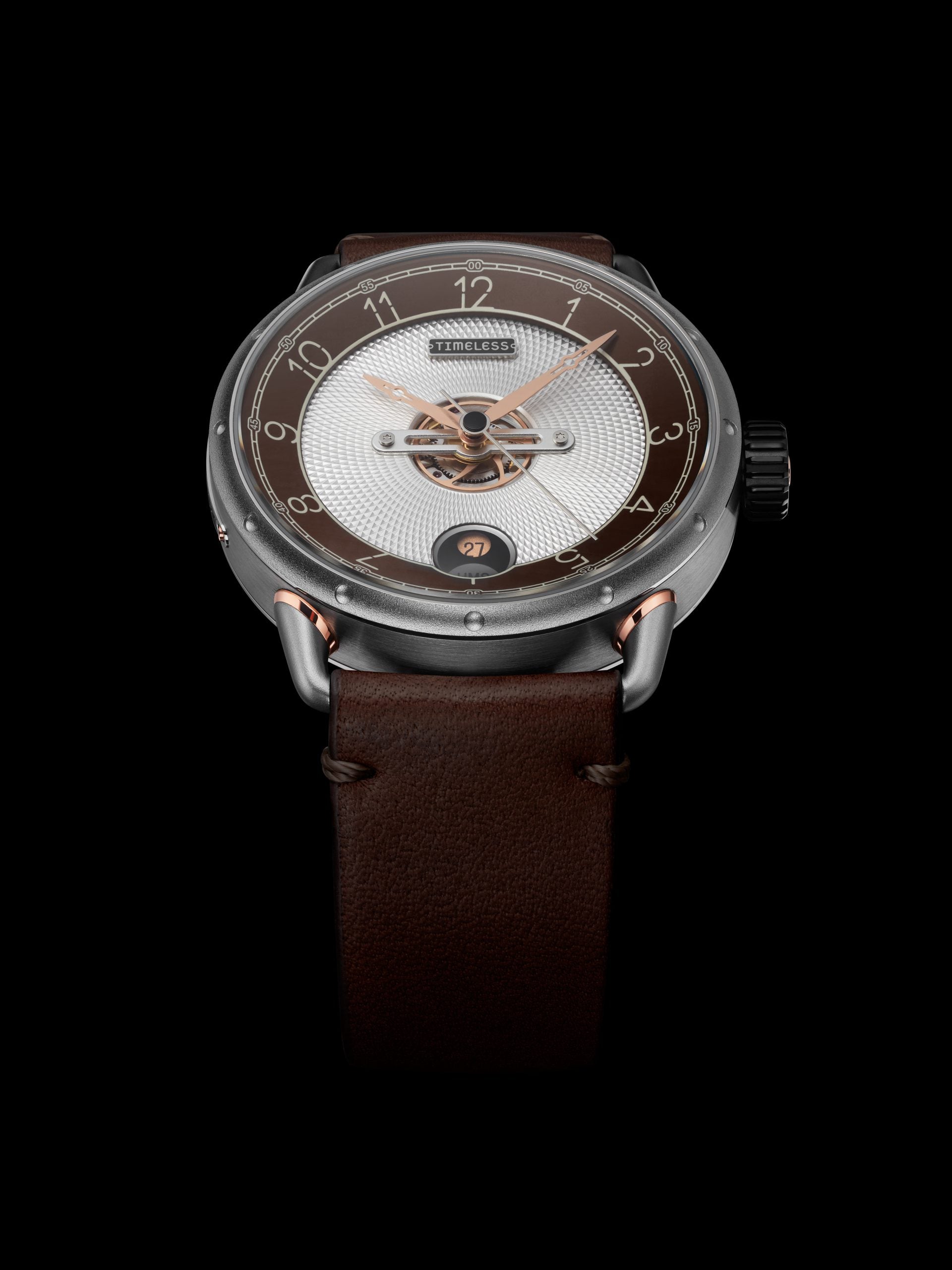 Second modèle de la marque Timeless, ce garde-temps en acier orné de fins détails plaqués en or rose et d’un verre saphir bombé sied à tous.