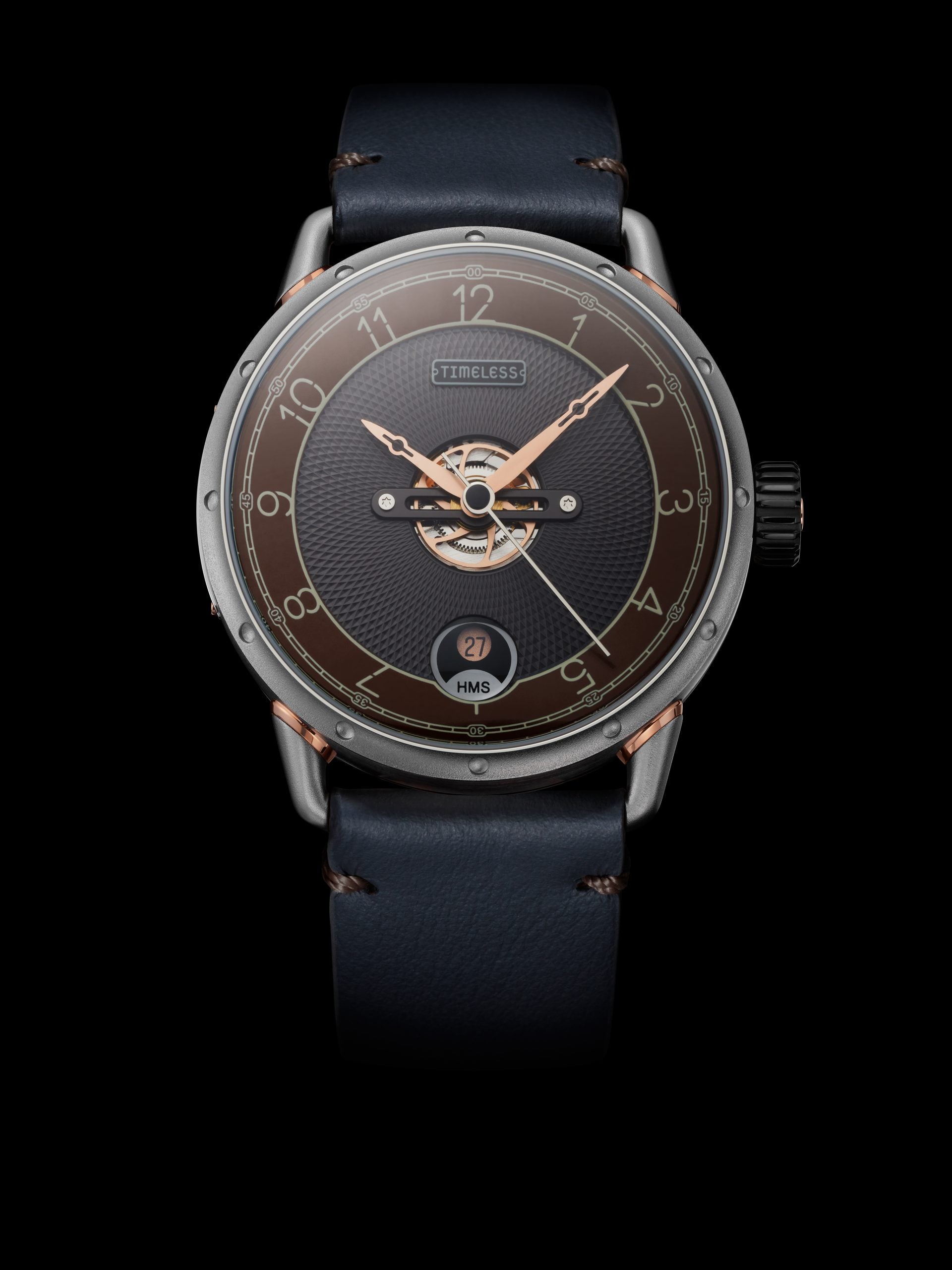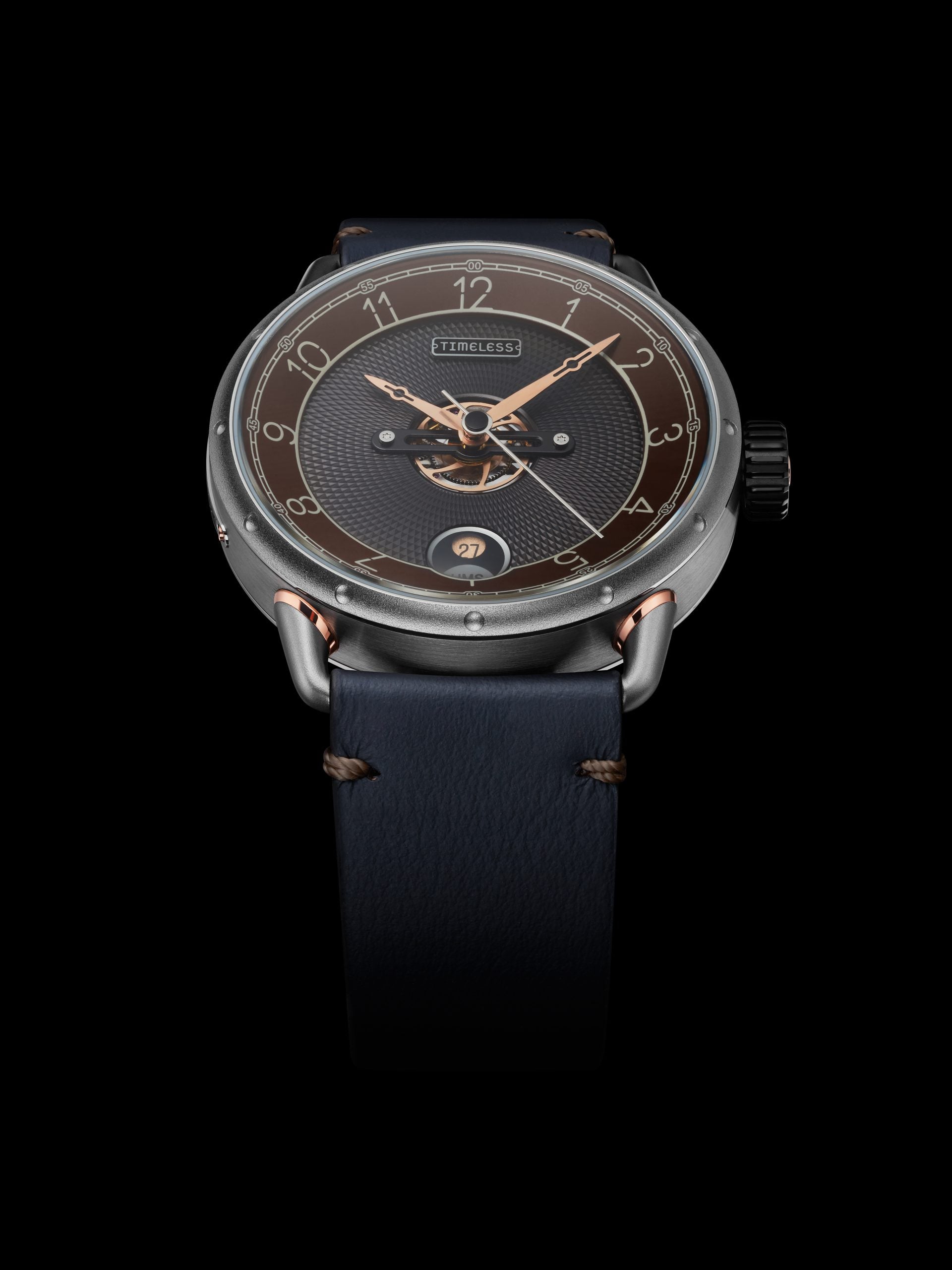 The second model of the Timeless brand, this steel timepiece is adorned with fine rose gold-plated details and a curved sapphire crystal that suits everyone.