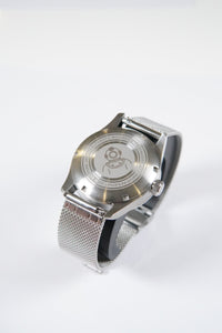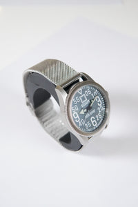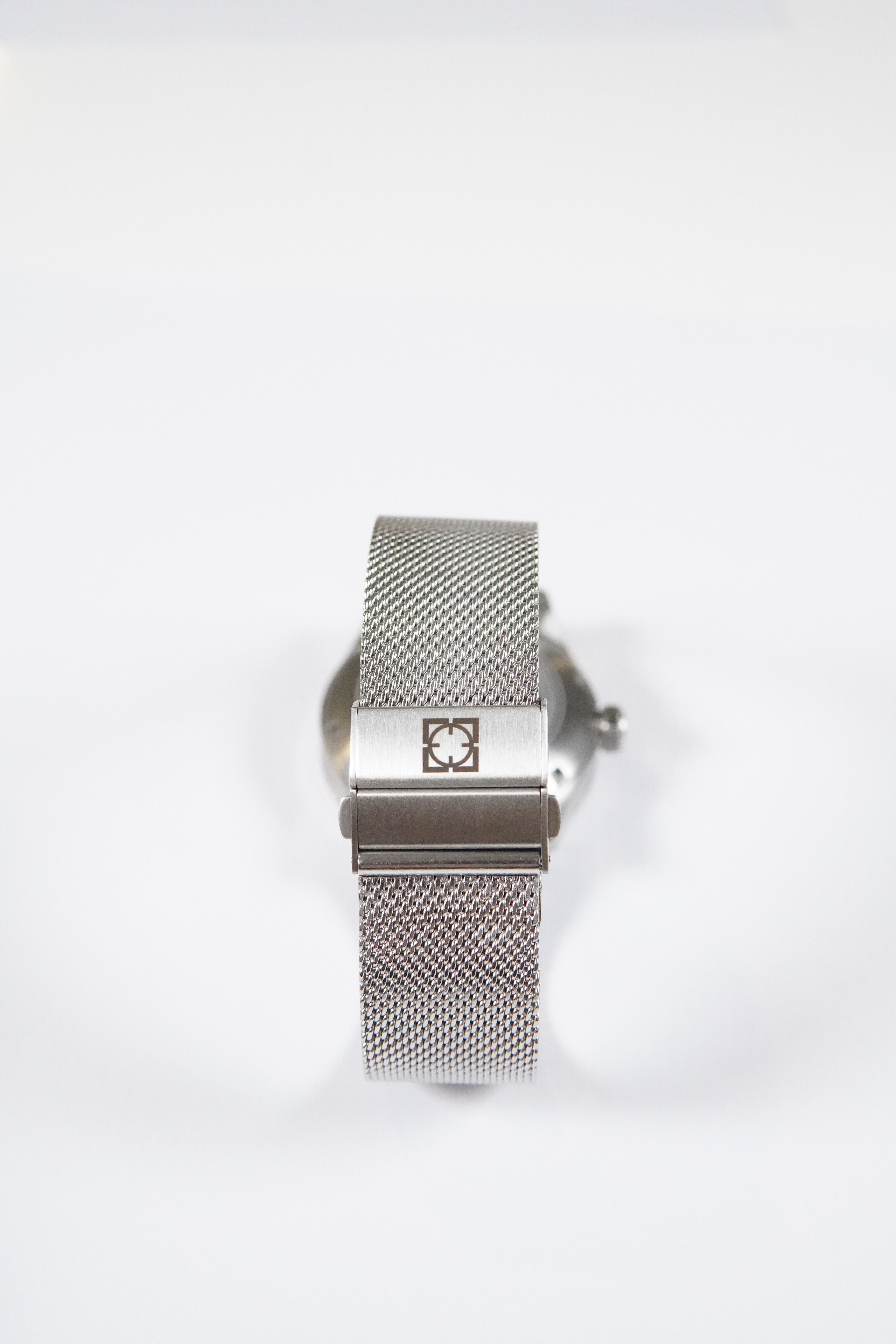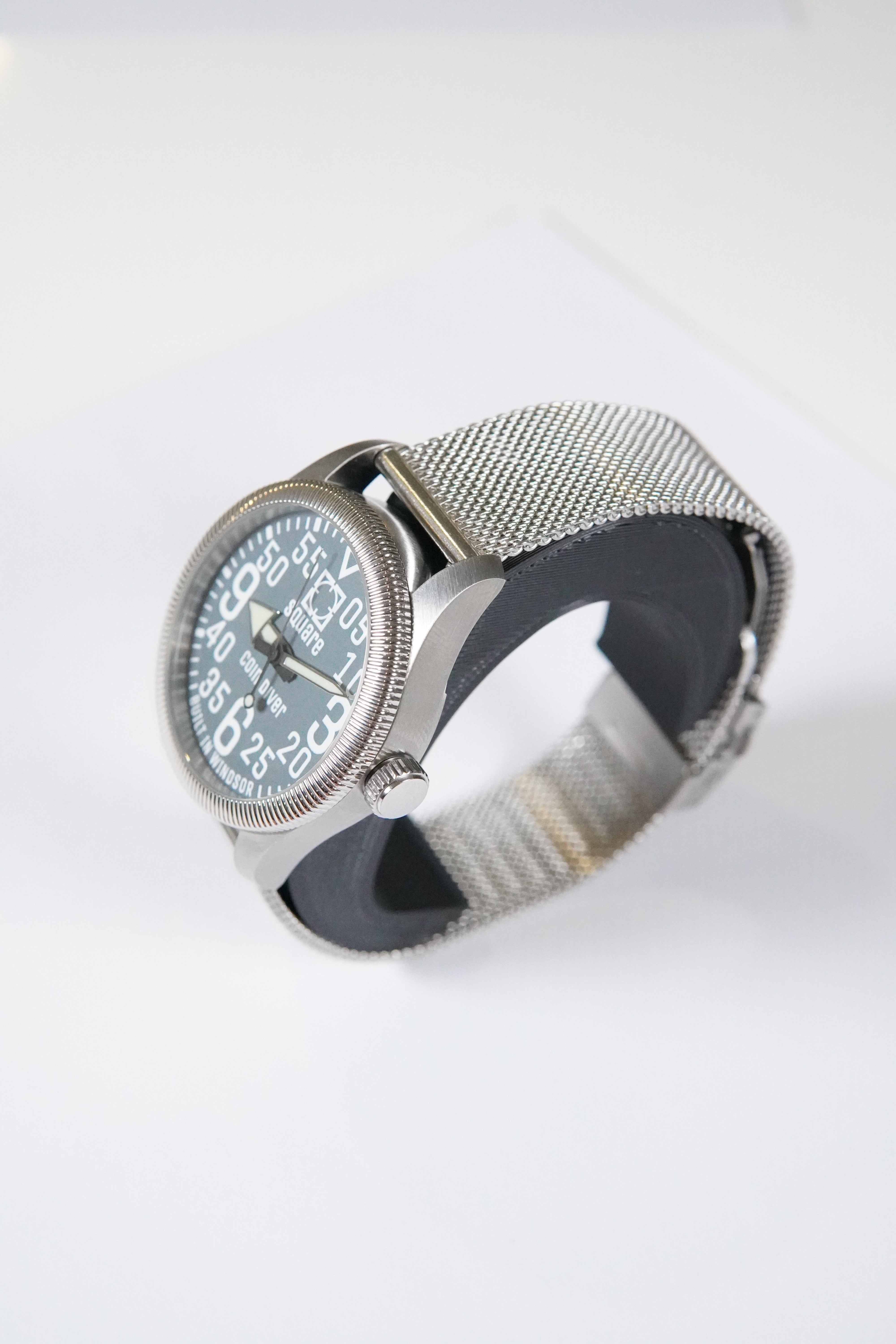 Each Coin Diver is meticulously assembled in Canada and paired with a rugged yet comfortable stainless steel shark mesh bracelet secured by a convenient folding clasp.