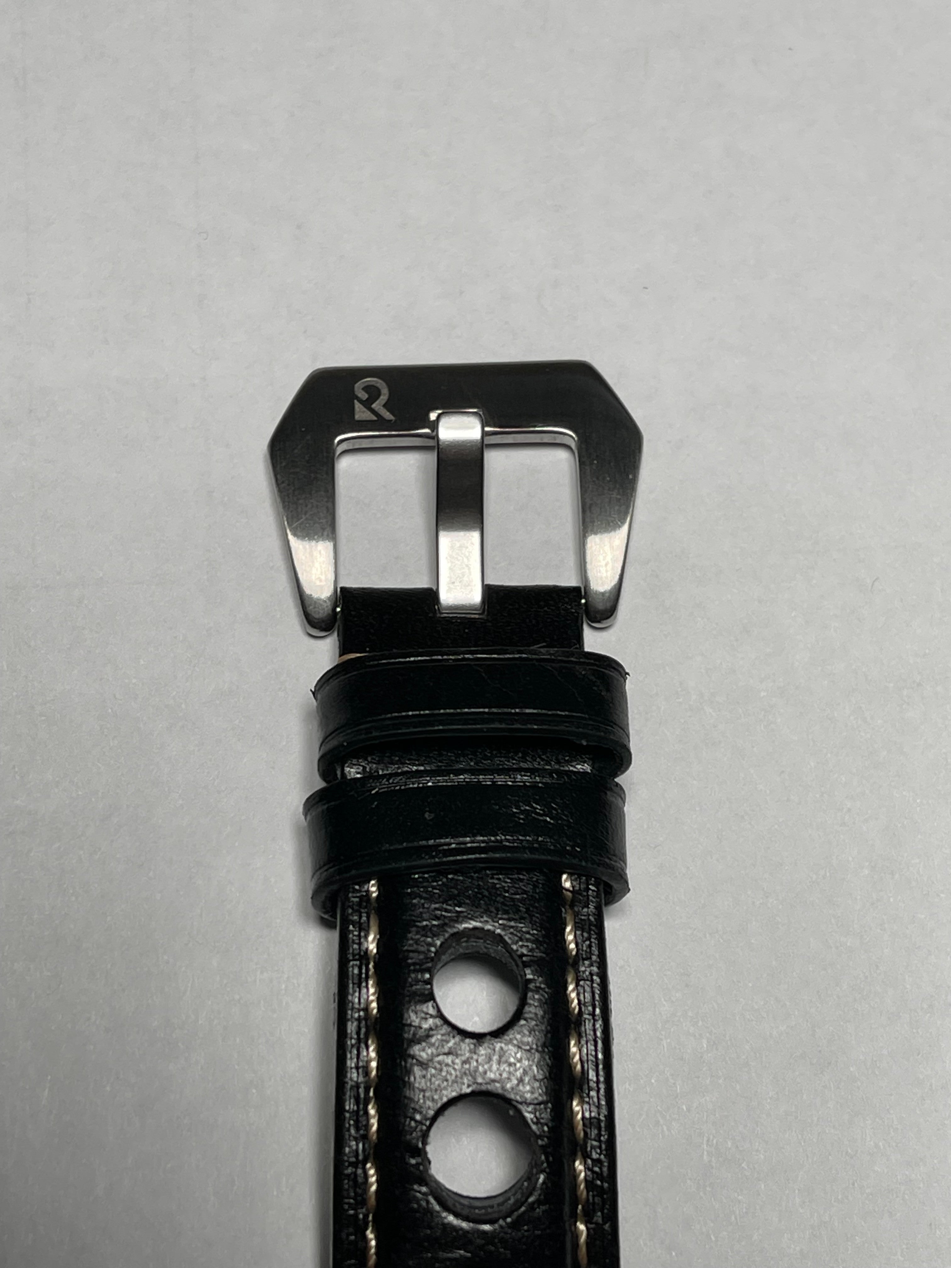 Black 22mm tapered Italian leather band with calfskin lining, quick release spring bars, monogrammed 316L stainless steel buckle.