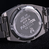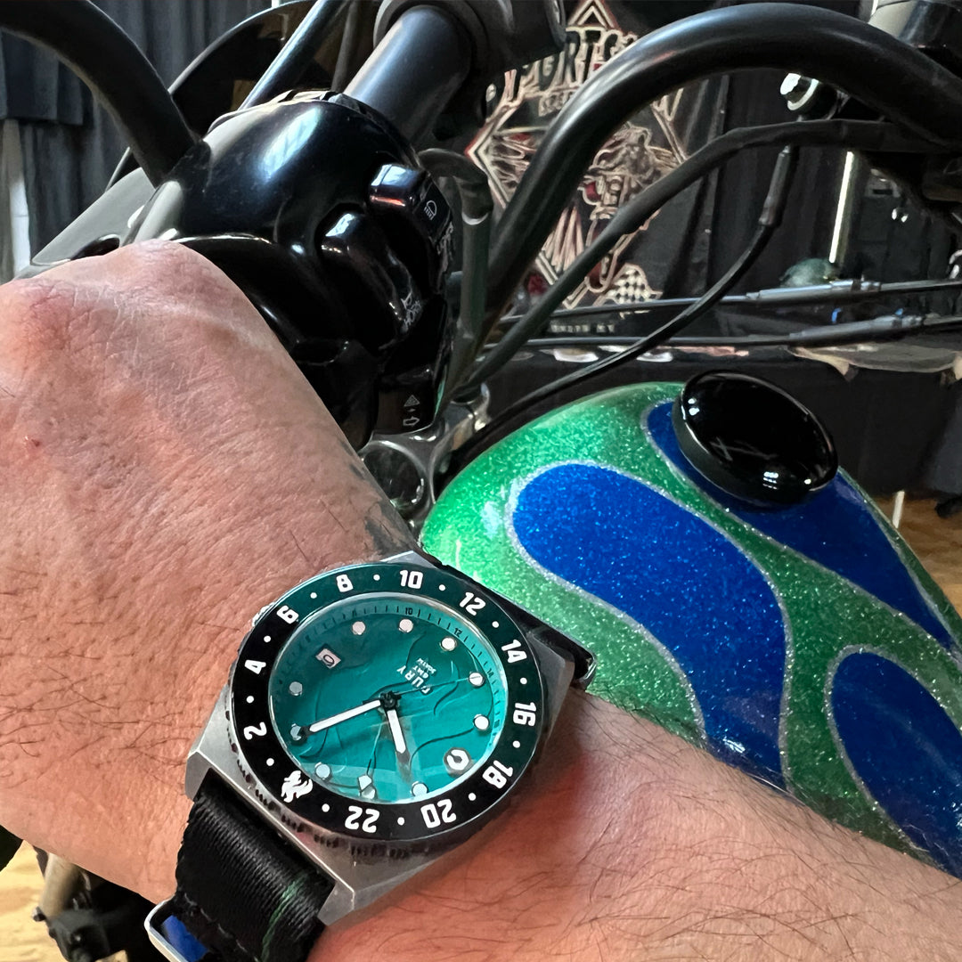 The bold colors of the engraved flamed dial and titanium brushed case were inspired by hotrods, tattoos, and long nights tinkering in the garage of our youth. What passion burns within you? Wherever you may roam may your passion follow!