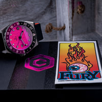 The bold colors of the engraved flamed dial and titanium brushed case were inspired by hotrods, tattoos, and long nights tinkering in the garage of our youth. What passion burns within you? Wherever you may roam may your passion follow!