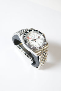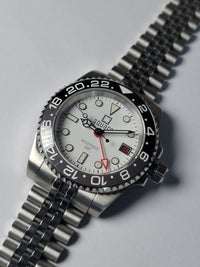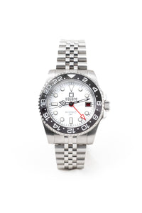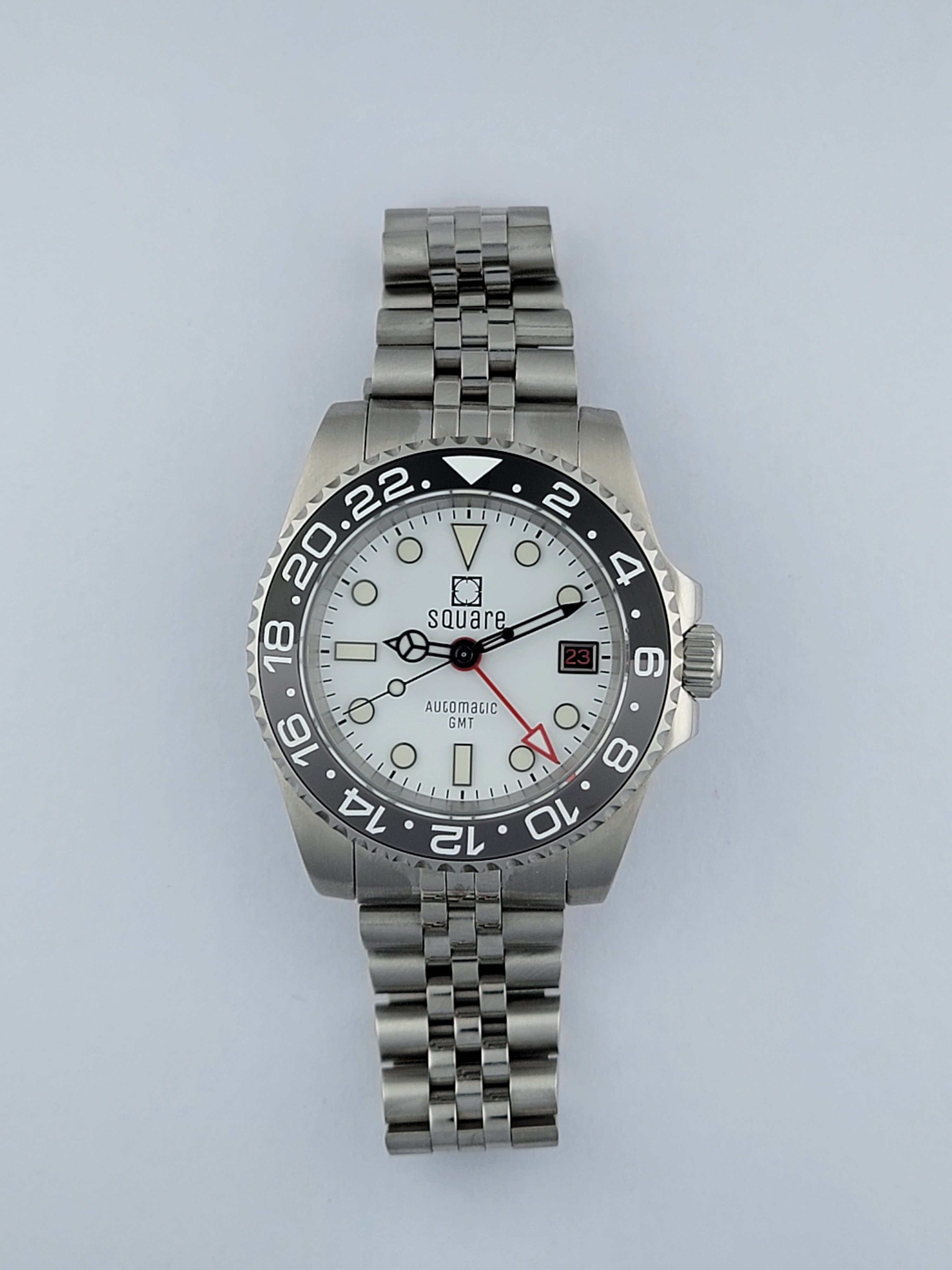 Purpose-built for travelers and professionals, the GMT-R is Square Watch Co.'s boldest GMT yet. Featuring a 40mm brushed stainless steel case and a crisp white dial with black accents, the GMT-R exudes classic sport-watch aesthetics with a modern edge. Equipped with the robust NH34 automatic GMT movement, scratch-resistant sapphire crystal, and a rugged 24-hour bezel, it’s ready for every journey. The stainless steel Jubilee bracelet, complete with a dual-locking clasp and on-the-fly micro-adjustment, ensures comfort and security from airports to alpine trails. Wherever you go, the GMT-R keeps perfect time — and perfect style.