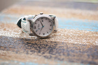 The Ambassador is available in three finishes (stainless steel, rose gold, black), each with the option of a black or white brushed dial. The Ambassador Steel White features our stainless steel case, signature blue second hand, white brushed dual-layered dial, and a single date window. Choose from a variety of leather, silicone, or stainless steel band options.