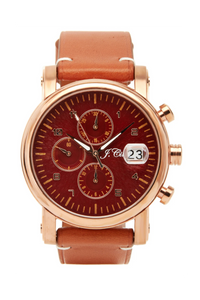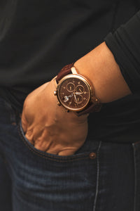The Series II Marshal Chronograph features a Rose Gold case with a Burgundy, textured enamel dial.