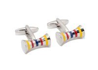 New for Wedding Season is our hourglass-shaped multicolor cuff links. A sturdy cuff link back with a touch of yellow, red, and blue gives this cuff link design versatility to be worn with a variety of colors.