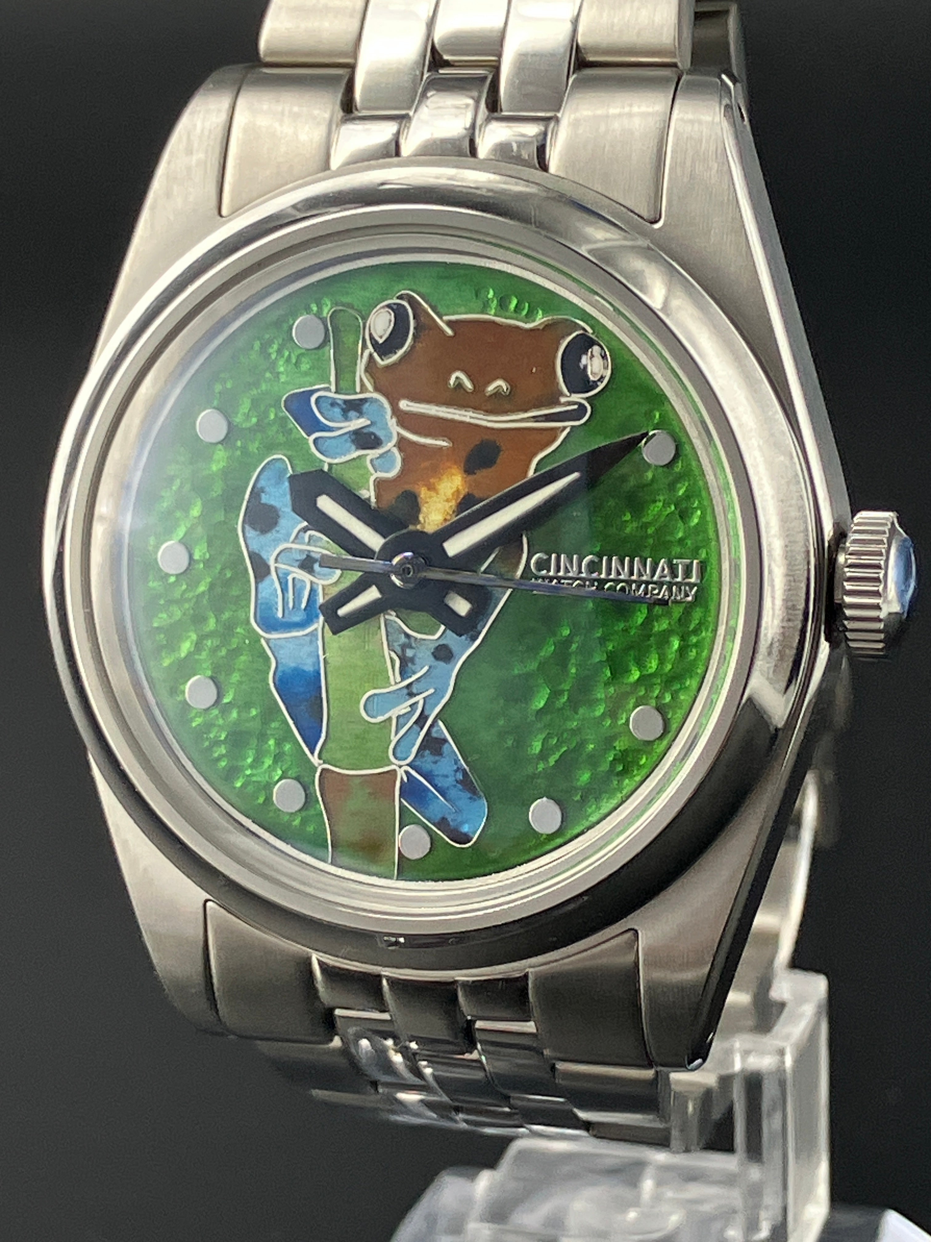 One of the first enamel pieces I did was a green tree frog. I really loved it so I decided to make a poison dart frog that would honor and support the Cincinnati Zoo. The dial is handcrafted with .999 Fine Silver using traditional cloisonné techniques. The wires which outline the cells for the enamel are hand bent and attached to the dial. Each cell is filled with vitreous (grand feu) enamel from Japan and fired multiple times in the kiln at about 1400 degrees Fahrenheit.