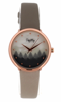 This nature-led design features a 29mm rose gold case, rose-gold hands and sparkling stud-set dial markers. A quiet forest silhouette rises against a soft green/grey-to-white gradient sky, creating a peaceful, organic feel. Elegant, warm and beautifully understated.