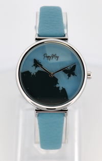 A soothing baby-blue strap pairs with a polished stainless-steel case and a serene layered sky-blue gradient dial. A delicate butterfly silhouette drifts across the display, accompanied by sleek minimalist hands and subtle lower-quarter dial markers for clarity without clutter. Graceful, calming and effortlessly wearable.