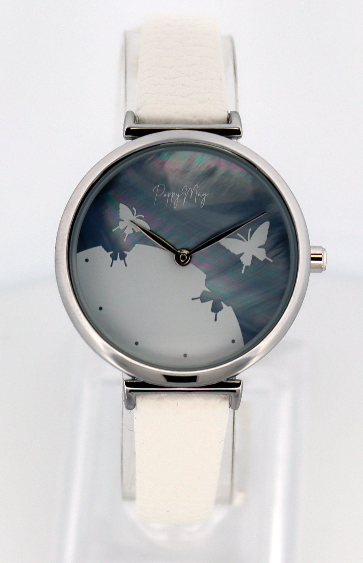 A luminous take on the butterfly theme. This variant features a shimmering blue mother-of-pearl dial, shifting gently with the light. White butterfly silhouettes float across the pearlescent backdrop, accompanied by polished silver hands, a stainless-steel case, and a slim white leather strap for a crisp, elegant finish.