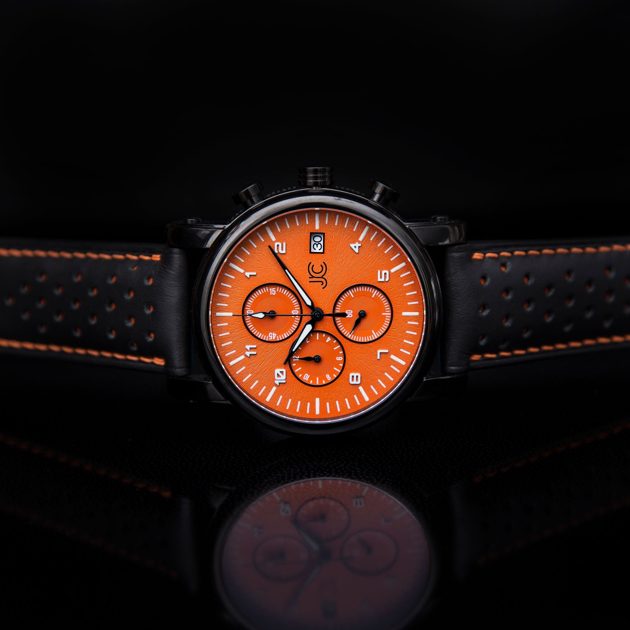 22mm Black calf-skin leather strap with EXTRA LENGTH, orange stitching and accents, and a black buckle. This strap has a quick release function and an engraved J.Ciro Logo.