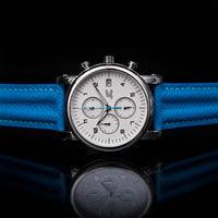 22mm Blue textured calf-skin leather strap with blue stitching and accents and a stainless steel buckle. This strap has a quick release function and an engraved J.Ciro Logo.