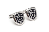J.Ciro's Shield Cuff Links feature a silver finish with a black enamel inlay and a dozen silver stars. These cuff links make a great addition to any casual or formal attire.