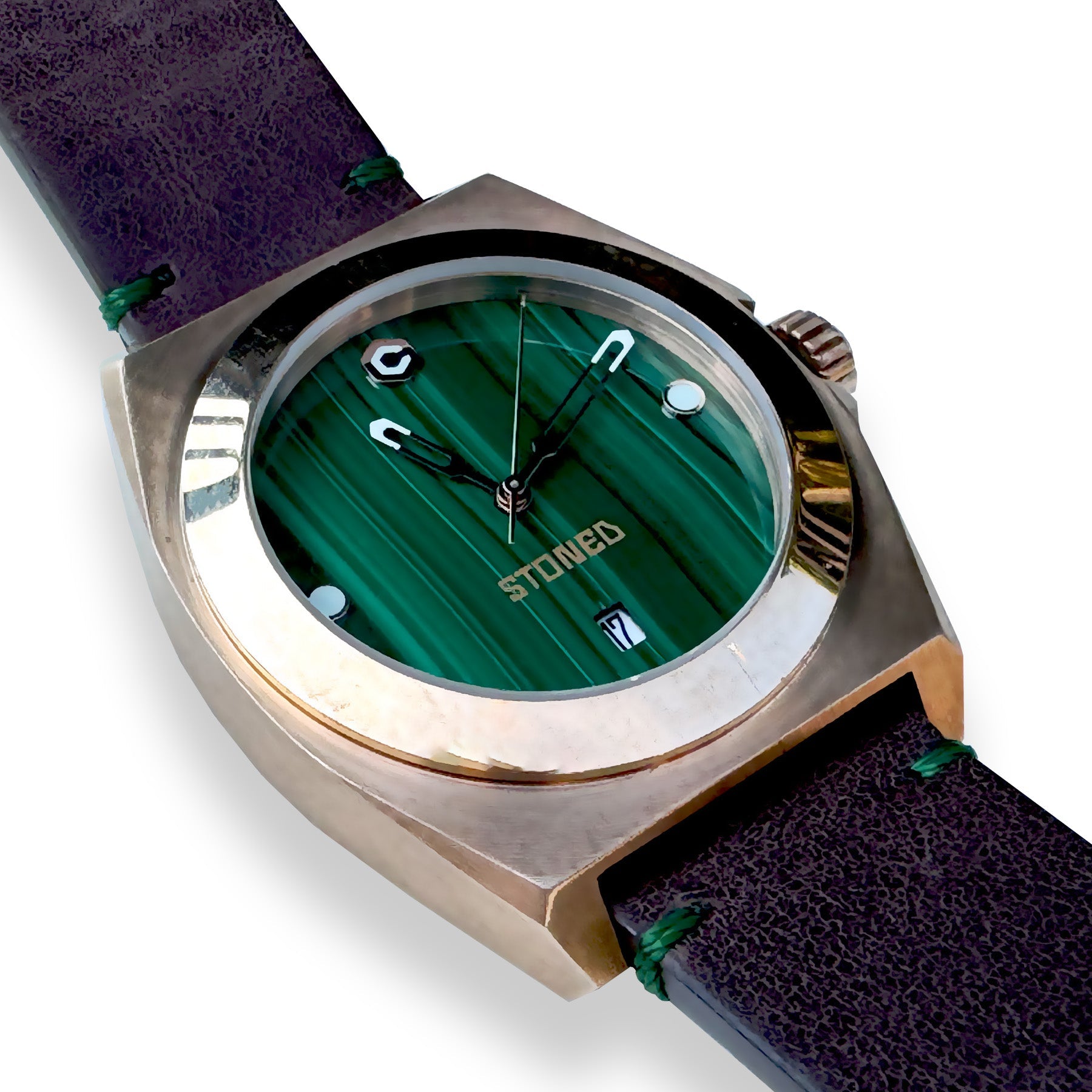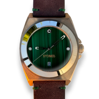 Like a fine wine its aged and pre patinaed as HIS or HERS . . . Introducing STONED, the new timepiece that evolves with you—a piece that speaks to the passage of time and life’s personal journey. Our bronze case, with gemstone dial, starts your journey as an elegant statement and grows richer with every wear. The bronze develops a unique patina over time, becoming a reflection of your experiences and the life you live. This watch is more than a refined timepiece; it’s a companion on your journey, deepening your connection to the moments you cherish and the time you carry with you.