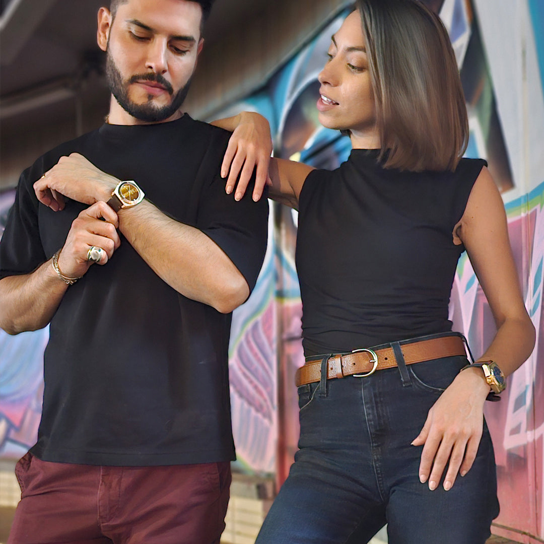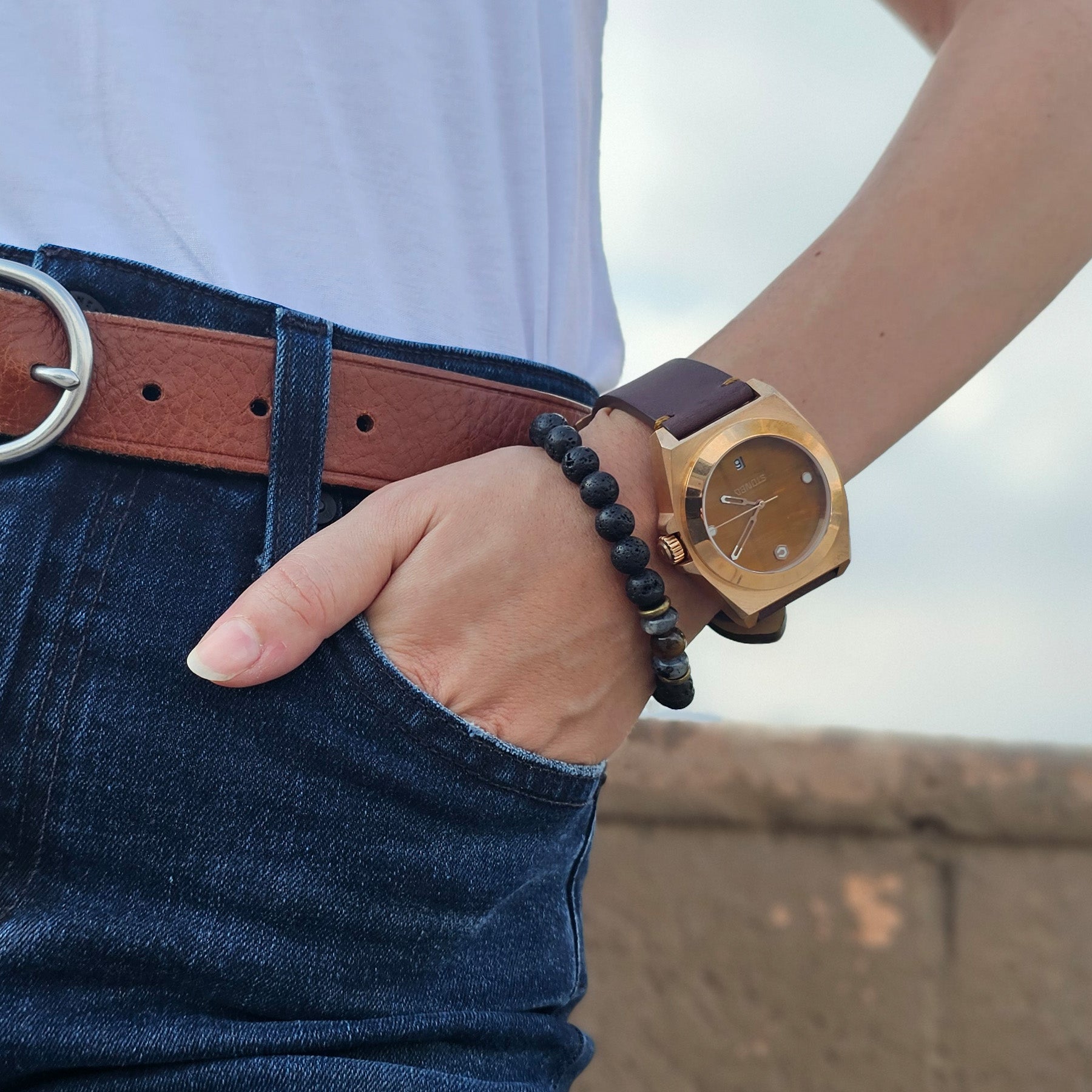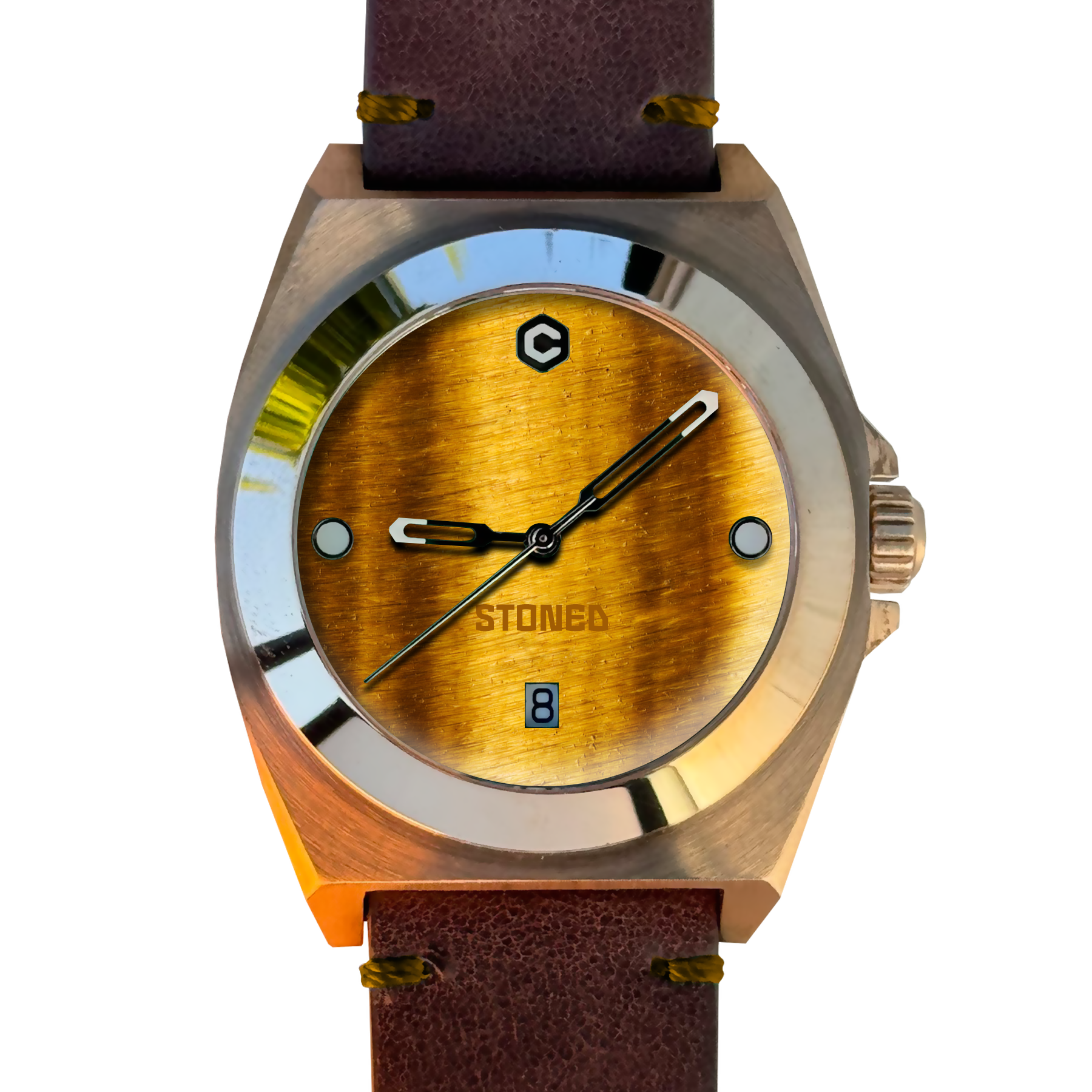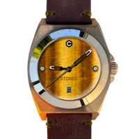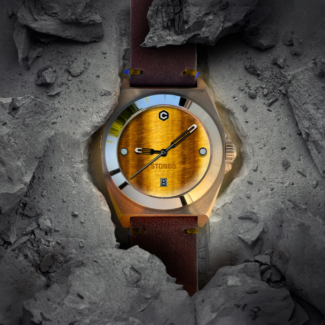Like a fine wine it's aged and pre patinaed as HIS or HERS . . . Introducing STONED, the new timepiece that evolves with you—a piece that speaks to the passage of time and life’s personal journey. Our bronze case, with gemstone dial, starts your journey as an elegant statement and grows richer with every wear. The bronze develops a unique patina over time, becoming a reflection of your experiences and the life you live. This watch is more than a refined timepiece; it’s a companion on your journey, deepening your connection to the moments you cherish and the time you carry with you.