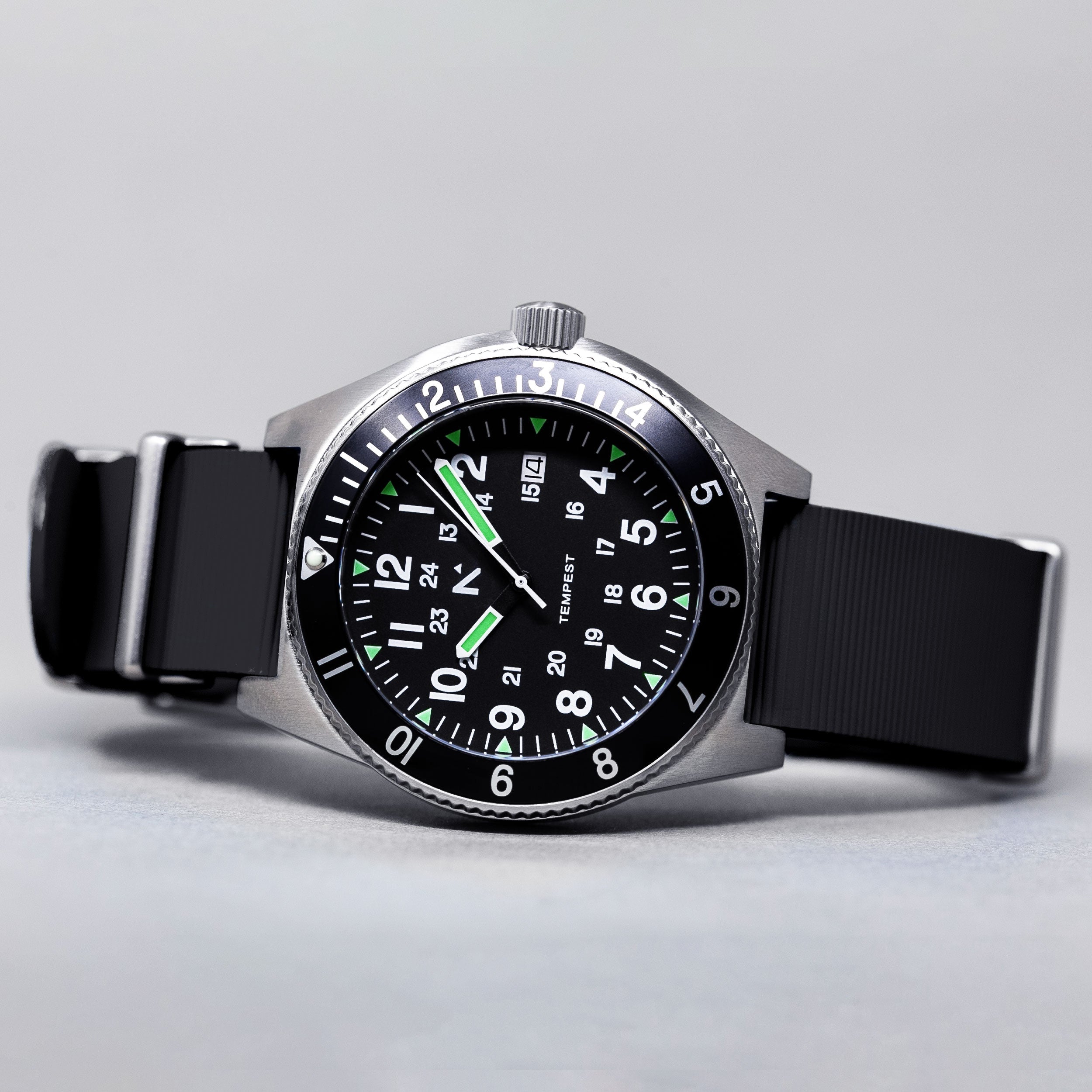 The Tempest is the ultimate stripped back navigator watch designed for pure adventure. Equipped with a high-precision quartz, 5-jewel movement and an ultra long-life battery, the Quartz variant is built in Germany, finished in the UK, and comes with a waterproof NATO-style strap made in Italy from sustainably-sourced rubber.