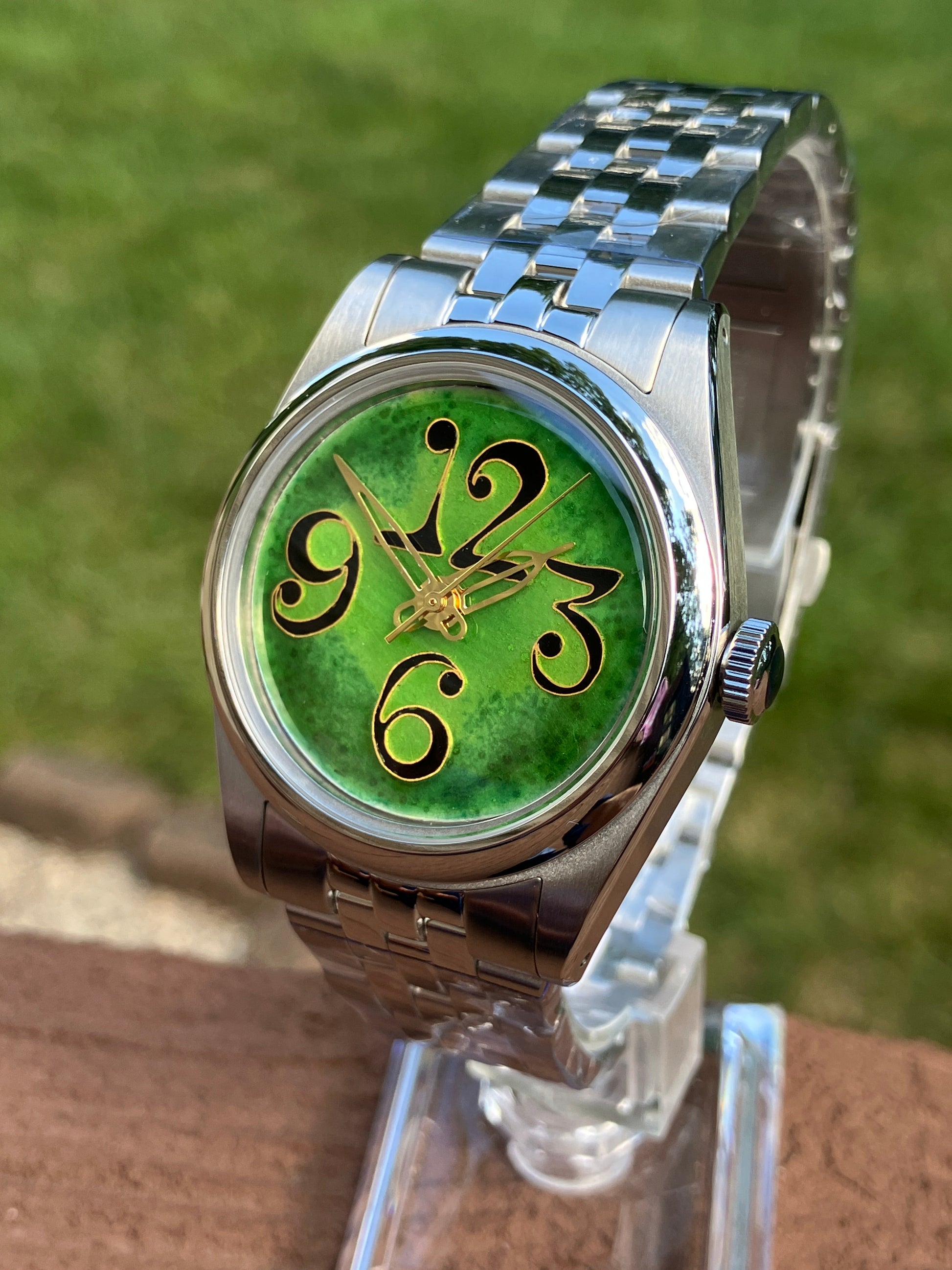 This dial was inspired by a trip to the Metropolitan Museum of Art in New York City. The font for the numbers was inspired by Charles Demuth's I Saw the Figure 5 in Gold. I was impressed by how the number dominated the work of art and the Art Deco font. I sat down and sketched this dial with excessively large numbers immediately. The dial is handcrafted with .999 Fine Silver and 24K gold wire using traditional cloisonné techniques. The wires which outline the cells for the enamel are hand bent and attached to the dial. Each cell is filled with vitreous (grand feu) enamel from Japan and fired multiple times in the kiln at about 1400 degrees Fahrenheit.