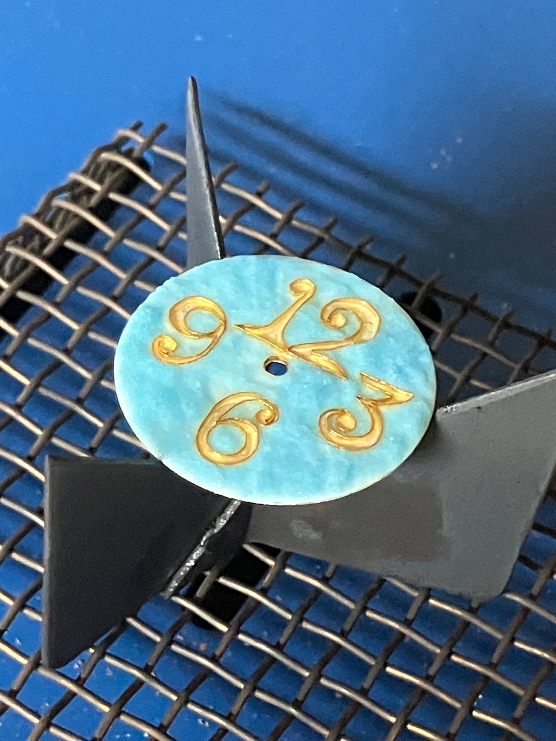 This dial was inspired by a trip to the Metropolitan Museum of Art in New York City. The font for the numbers was inspired by Charles Demuth's I Saw the Figure 5 in Gold. I was impressed by how the number dominated the work of art and the Art Deco font. I sat down and sketched this dial with excessively large numbers immediately. The dial is handcrafted with .999 Fine Silver and 24K gold wire using traditional cloisonné techniques. The wires which outline the cells for the enamel are hand bent and attached to the dial. Each cell is filled with vitreous (grand feu) enamel from Japan and fired multiple times in the kiln at about 1400 degrees Fahrenheit.