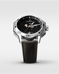 The black brushed dial on the Unbroko C1 bullet watch features a skeleton effect by the round bullet shaped holes showing pieces of the movement. 44mm Swiss-made automatic timepiece in a durable stainless steel case, blending masculine style with precision craftsmanship.