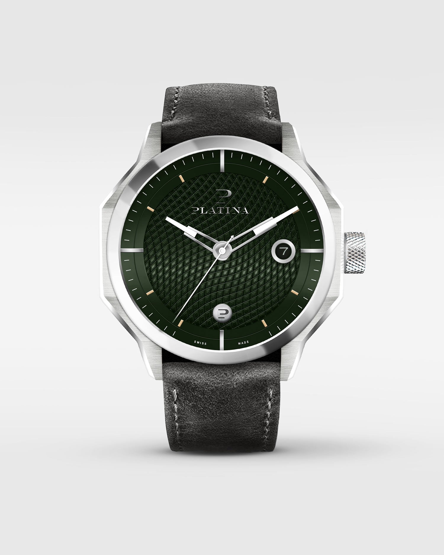Unbroko C1 vintage with a deep guilloche dial, Platina Platina Watch & Co logotype in polished steel and black date at 3 o’clock with a steel frame. 44mm Swiss-made automatic timepiece in a durable stainless steel case, blending masculine style with precision craftsmanship.
