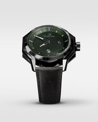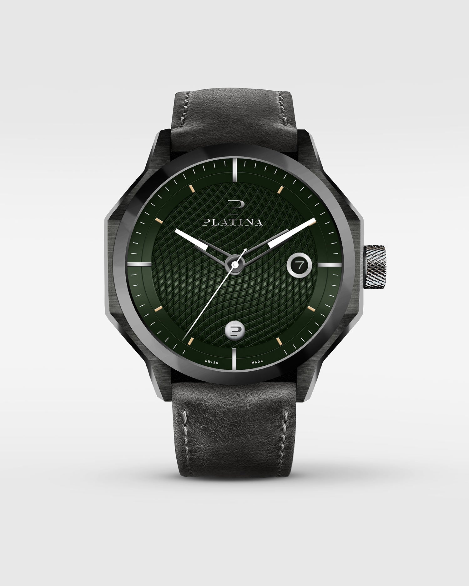 Unbroko C1 vintage with a deep guilloche dial, Platina Platina Watch & Co logotype in polished steel and black date at 3 o’clock with a steel frame. 44mm Swiss-made automatic timepiece in a durable anthracite/black treated stainless steel case.