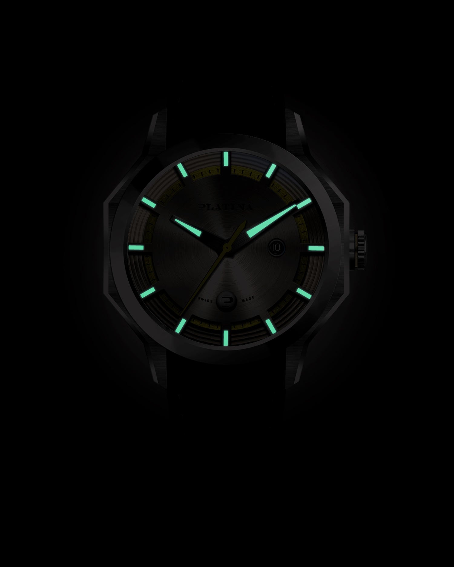 The Unbroko C3 Day to Night is a sleek Swiss-made men's timepiece featuring a brushed warm grey dial with vibrant yellow accents and luminous hands and numerals for visibility from day to night. It has a 42mm stainless steel case, bold geometric bezel, and a black date window at 3 o'clock.