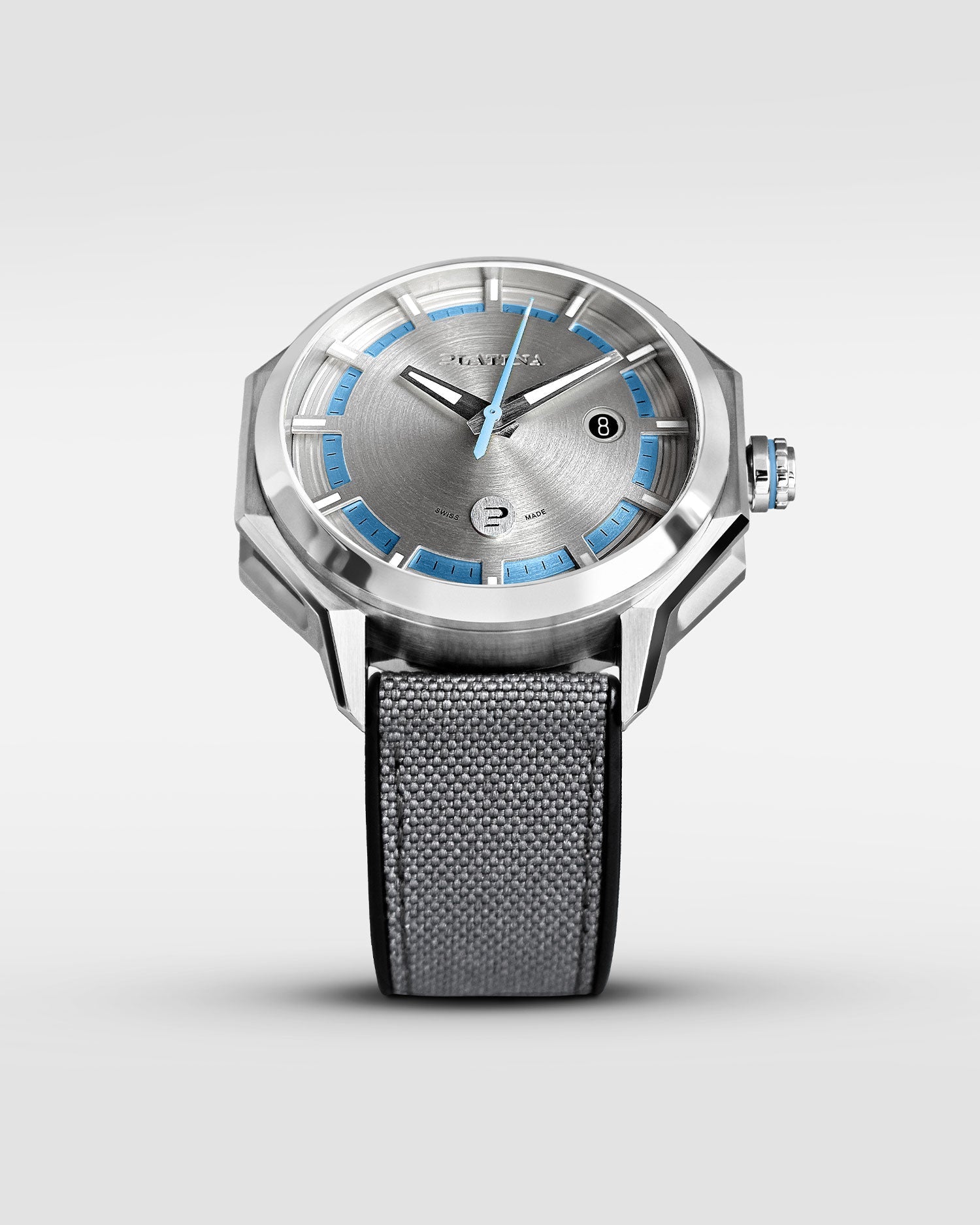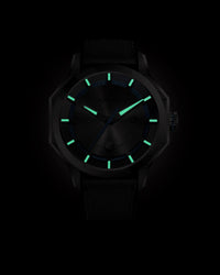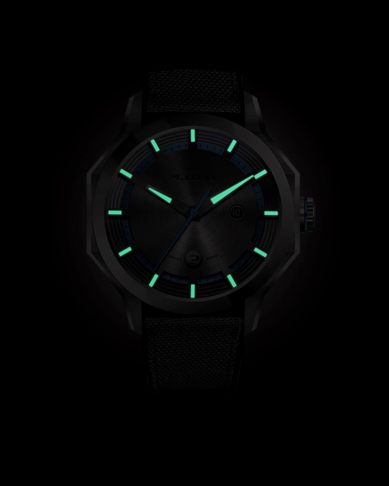 The Unbroko C3 Day to Night is a sleek Swiss-made men's timepiece featuring a brushed warm grey dial with vibrant yellow accents and luminous hands and numerals for visibility from day to night. It has a 42mm stainless steel case, bold geometric bezel, and a black date window at 3 o'clock.