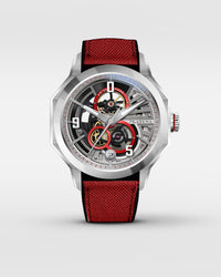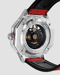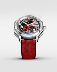 The Unbroko C3 Skeleton featuring a 42mm size case with slim height and lugs with a pop of colour added to the new shaped crown. The hour index is placed at the top layer with the hands floating smoothly underneath. The numerals 9, 5, 0 stands for 950 for the purity of platinum that is our brand foundation.