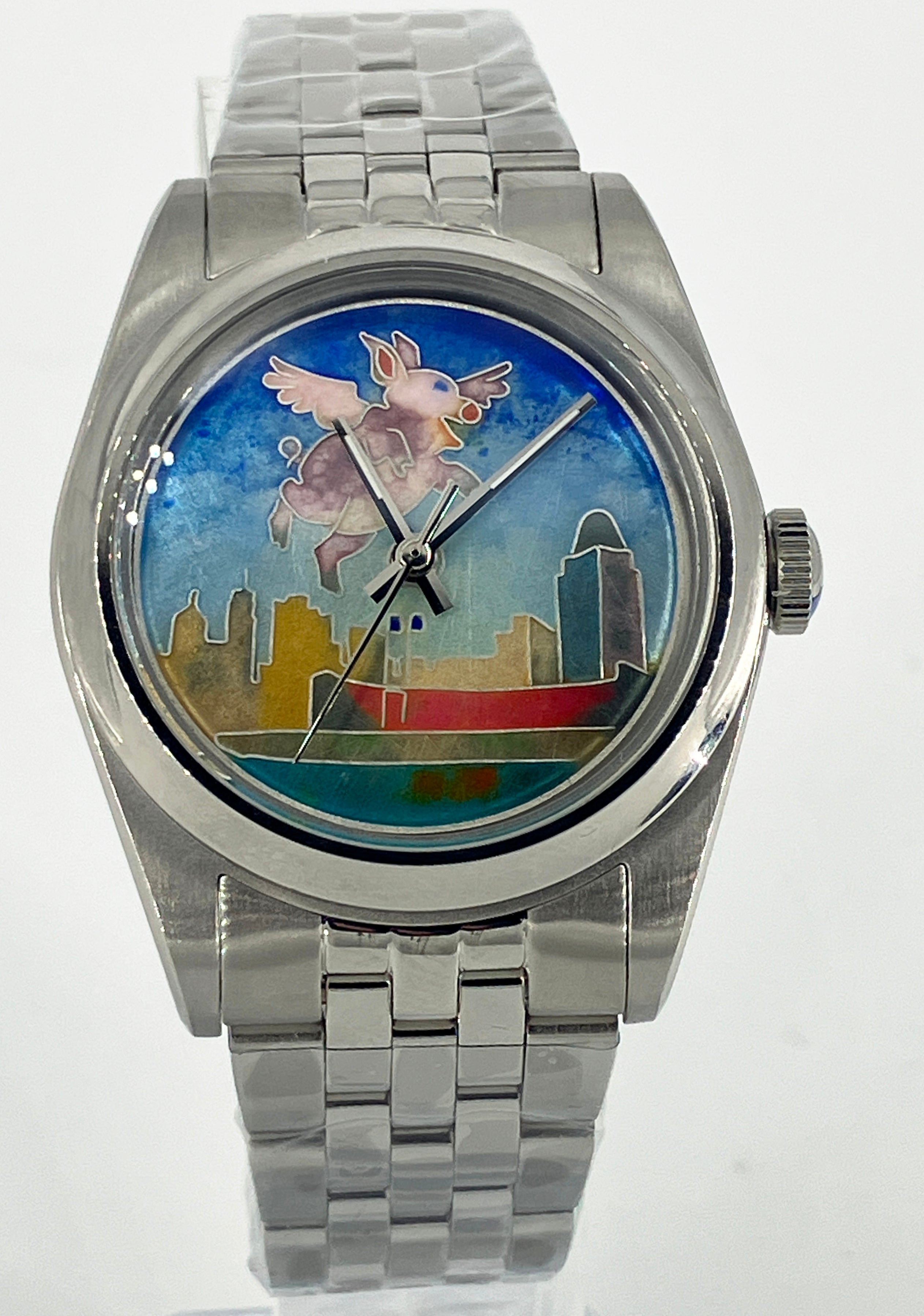 One of Cincinnati's nickname's is Porkopolis due to its long history of pork production. This watch features a fun image of a pig with wings flying over the Cincinnati Riverfront Skyline. The dial is handcrafted with .999 Fine Silver using traditional cloisonné techniques. The wires which outline the cells for the enamel are hand bent and attached to the dial. Each cell is filled with vitreous (grand feu) enamel from Japan and fired multiple times in the kiln at about 1400 degrees Fahrenheit.